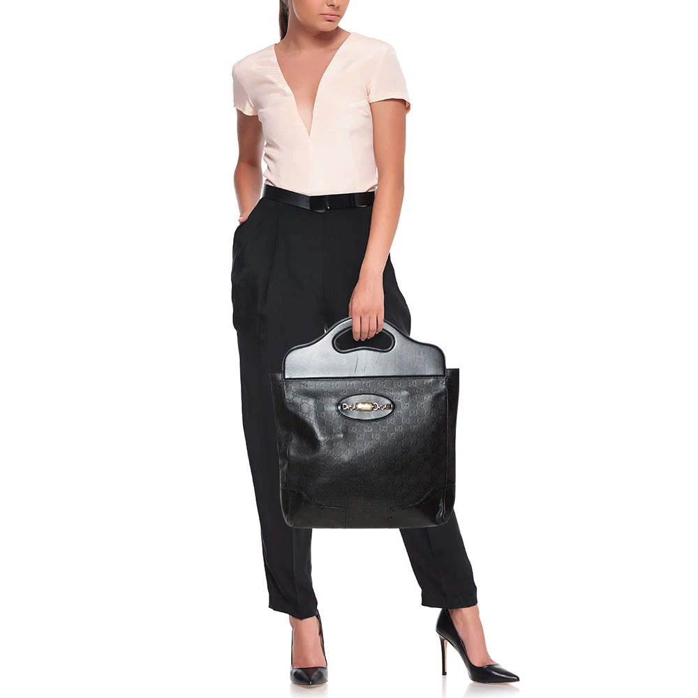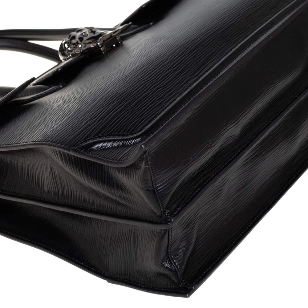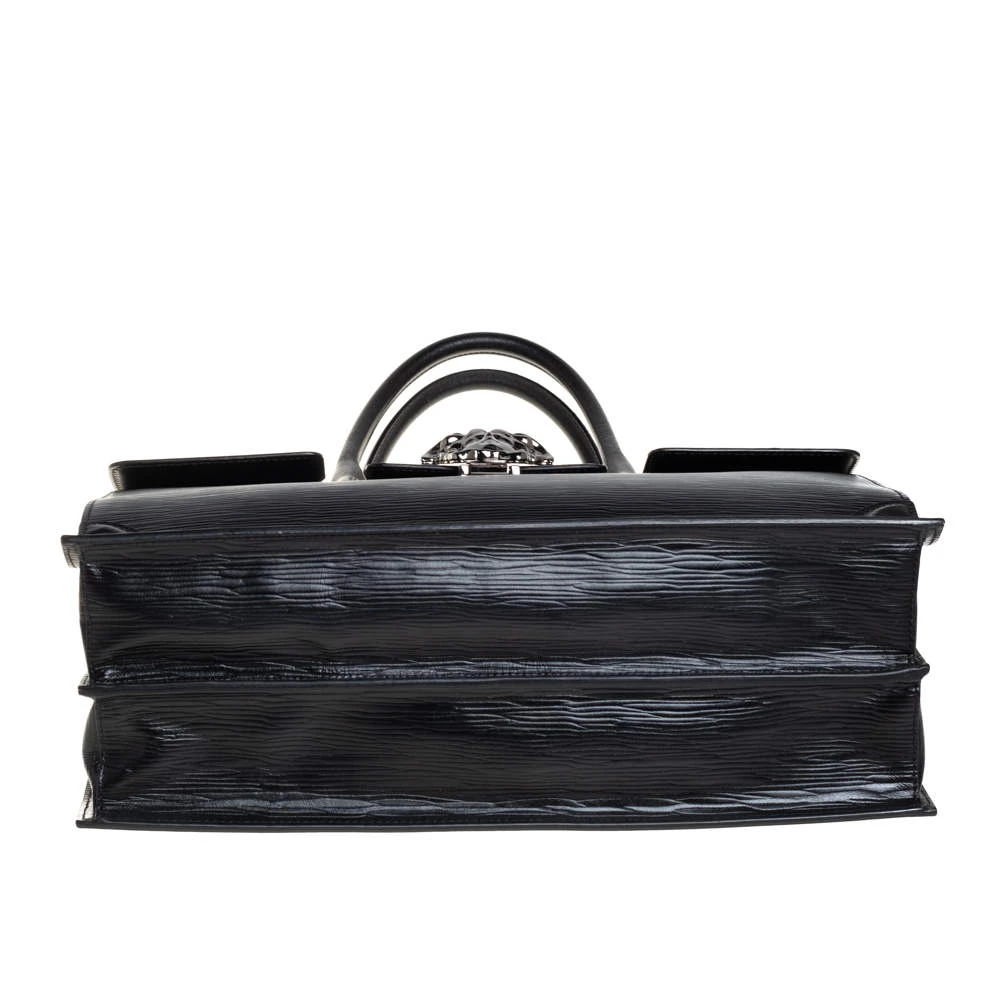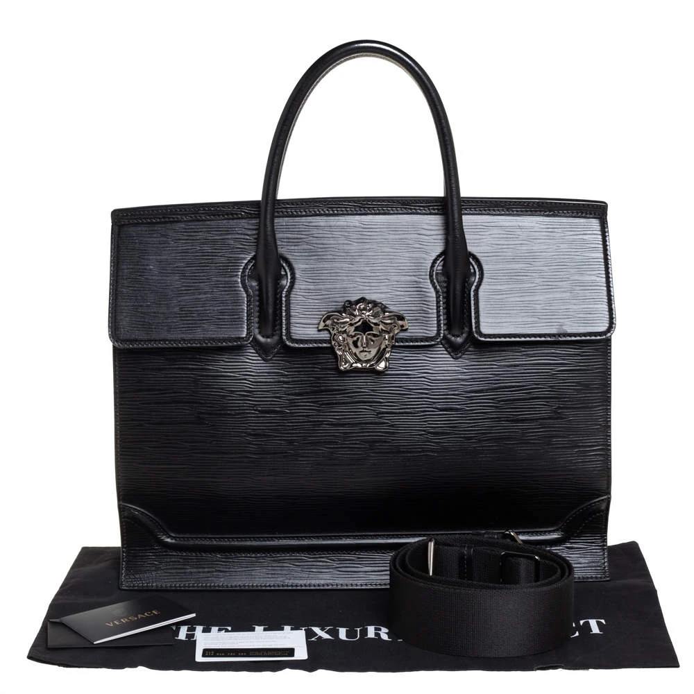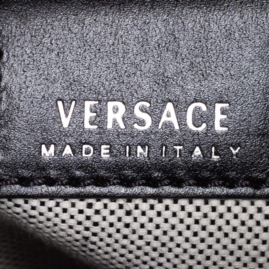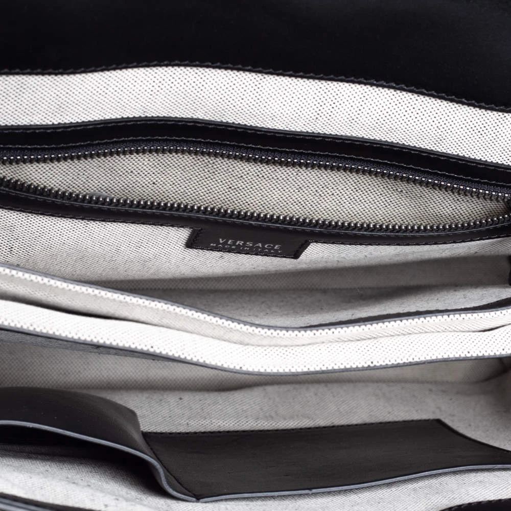This Palazzo Empire tote from Versace is just amazing! Exhibiting a chic persona, it comes crafted from black textured leather and features a front flap that carries the iconic Medusa motif. It opens to a canvas interior that can graciously accommodate your basic essentials. Equipped with dual top handles and a detachable shoulder strap, it is sure to be an investment-worthy buy!