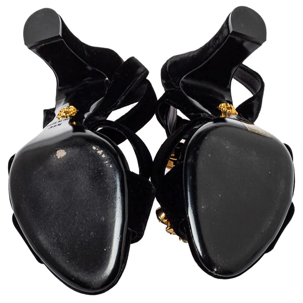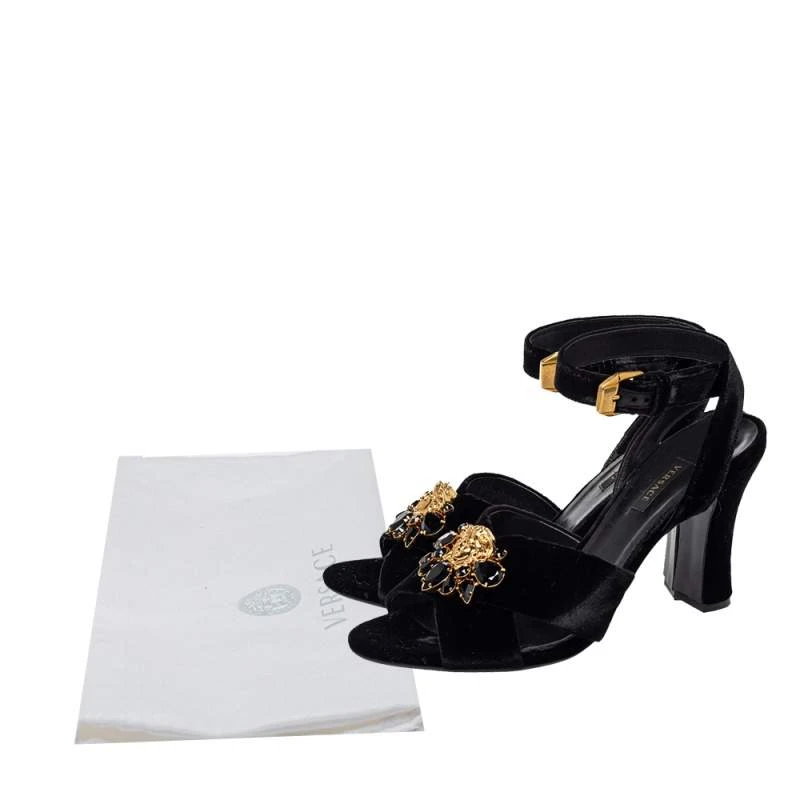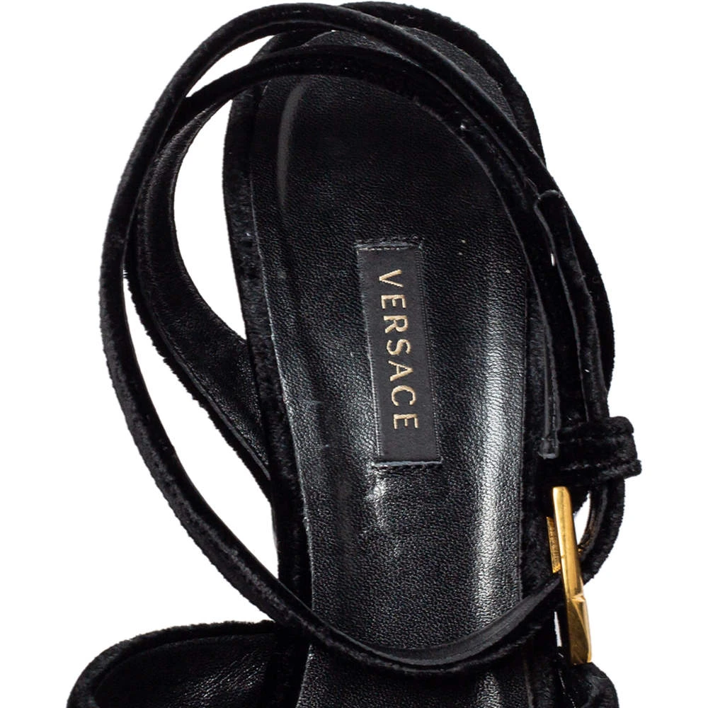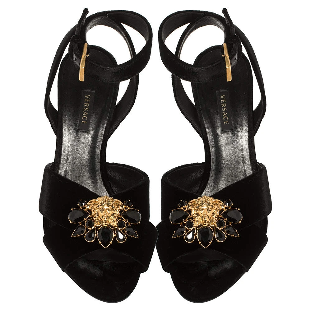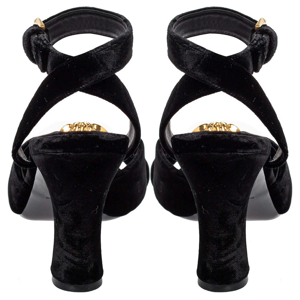 These gorgeous Versace sandals will adorn your feet in the most effortless way. Crafted from black velvet, they feature the iconic Medusa logo embellished with crystals on the front. The sandals are elevated on 9 cm heels and secured with ankle straps.