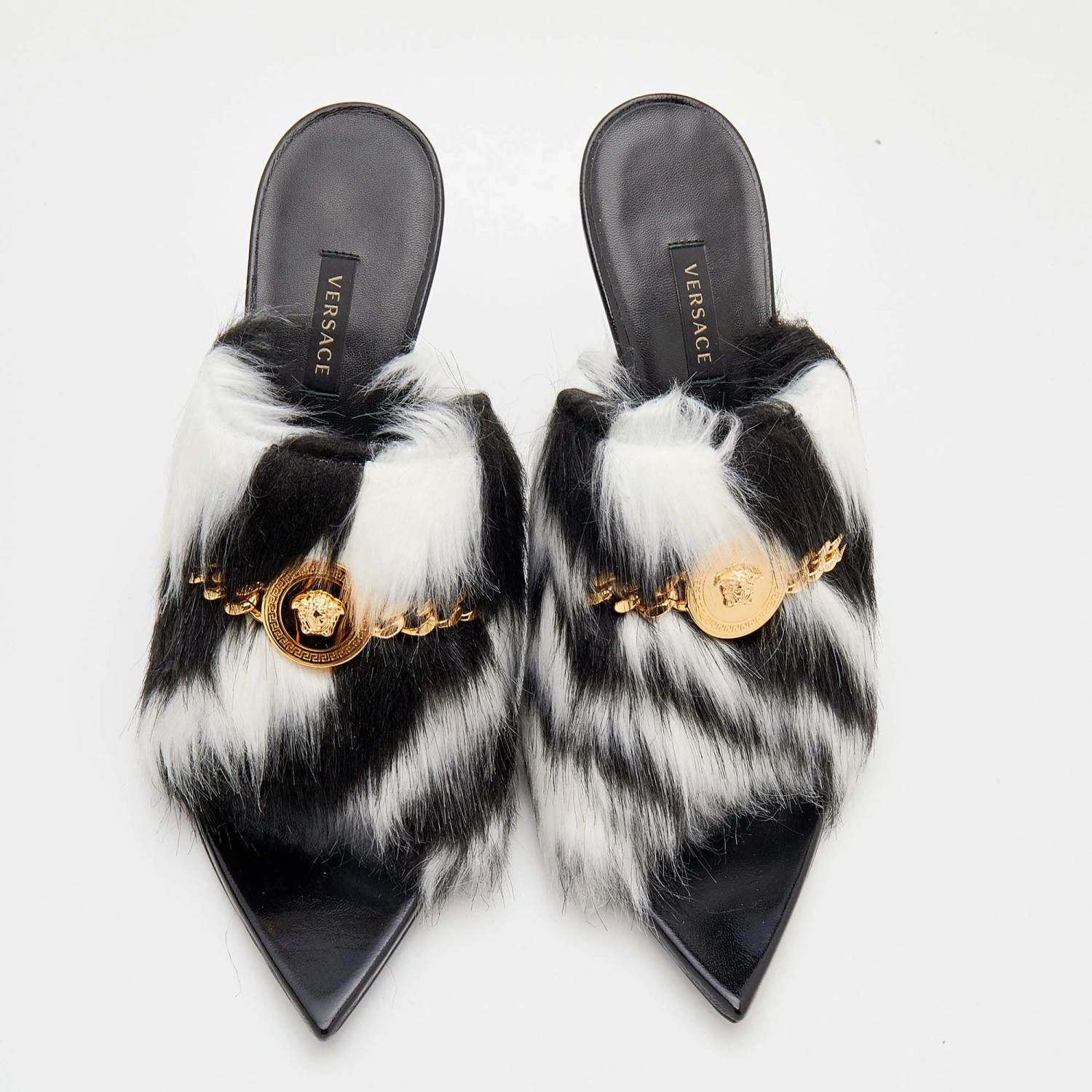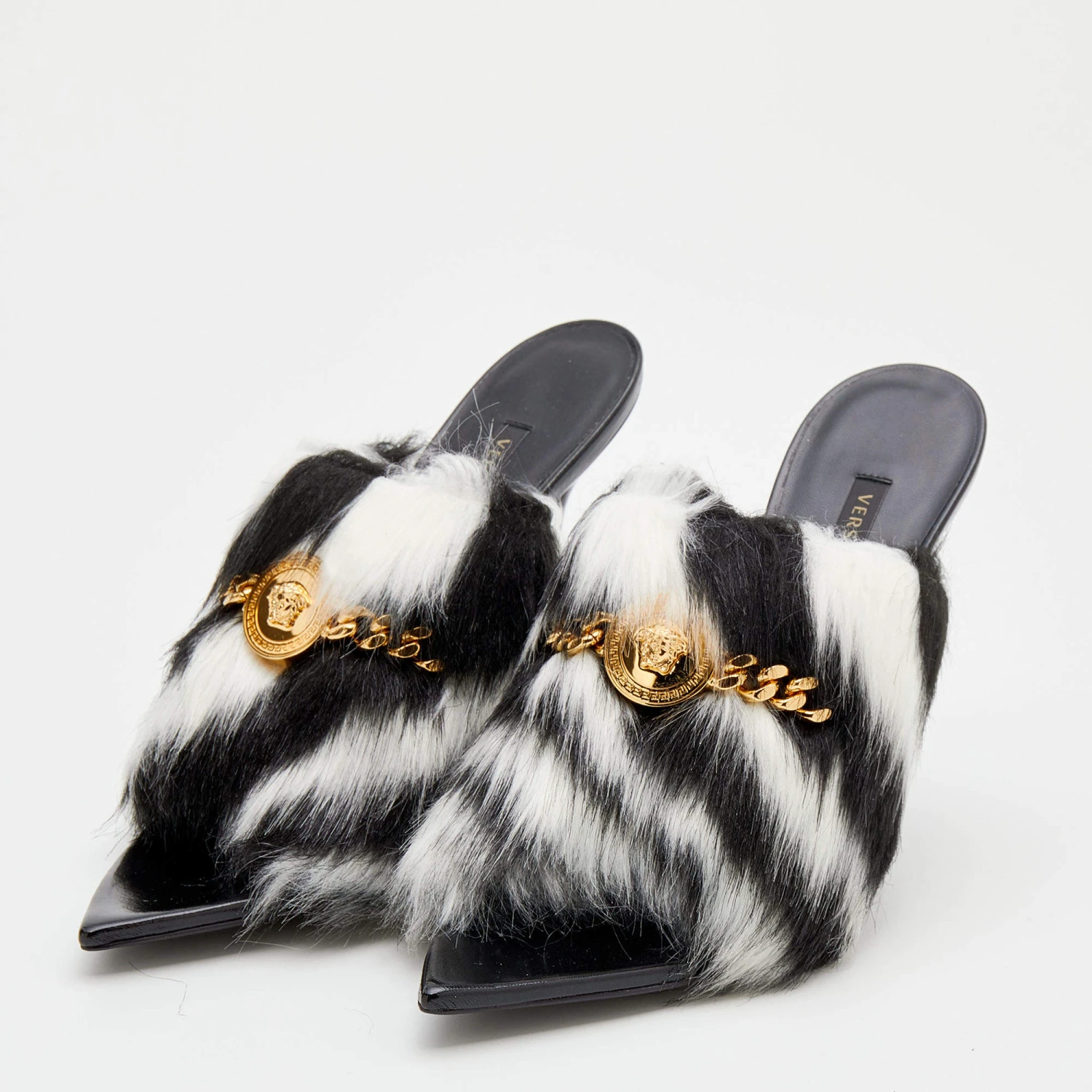 Crafted using faux fur and leather, these Versace sandals are meant to add a sophisticated finish to your look of the day. The designer shoes feature pointed tips, gold-tone metal accents, and 12 cm heels.