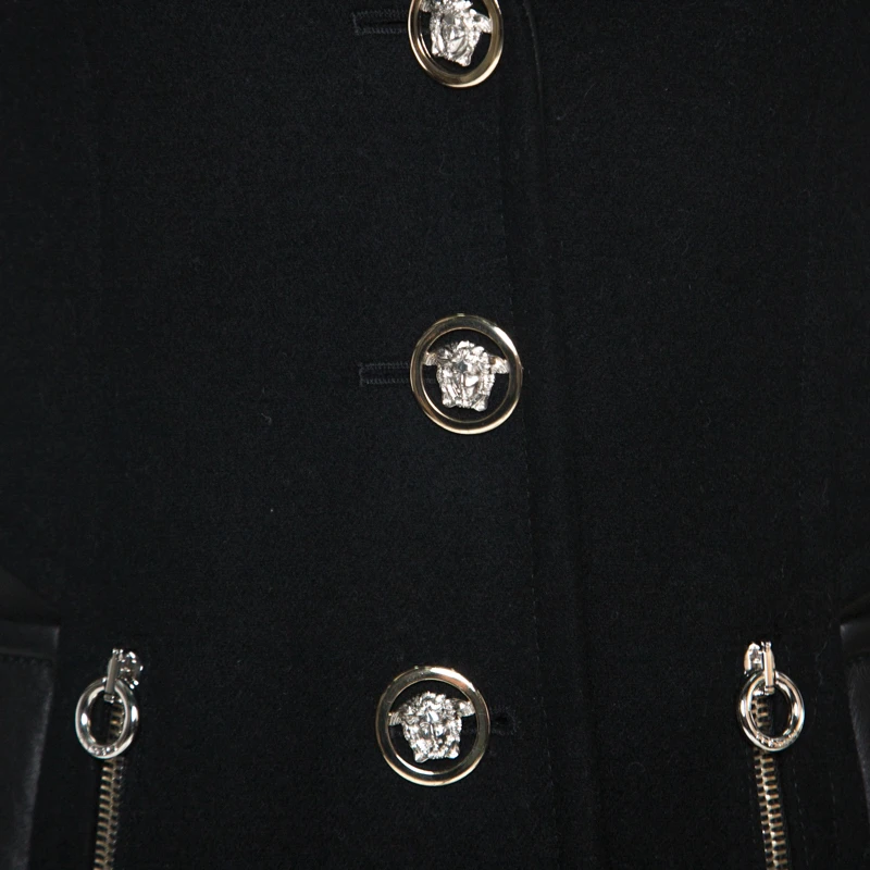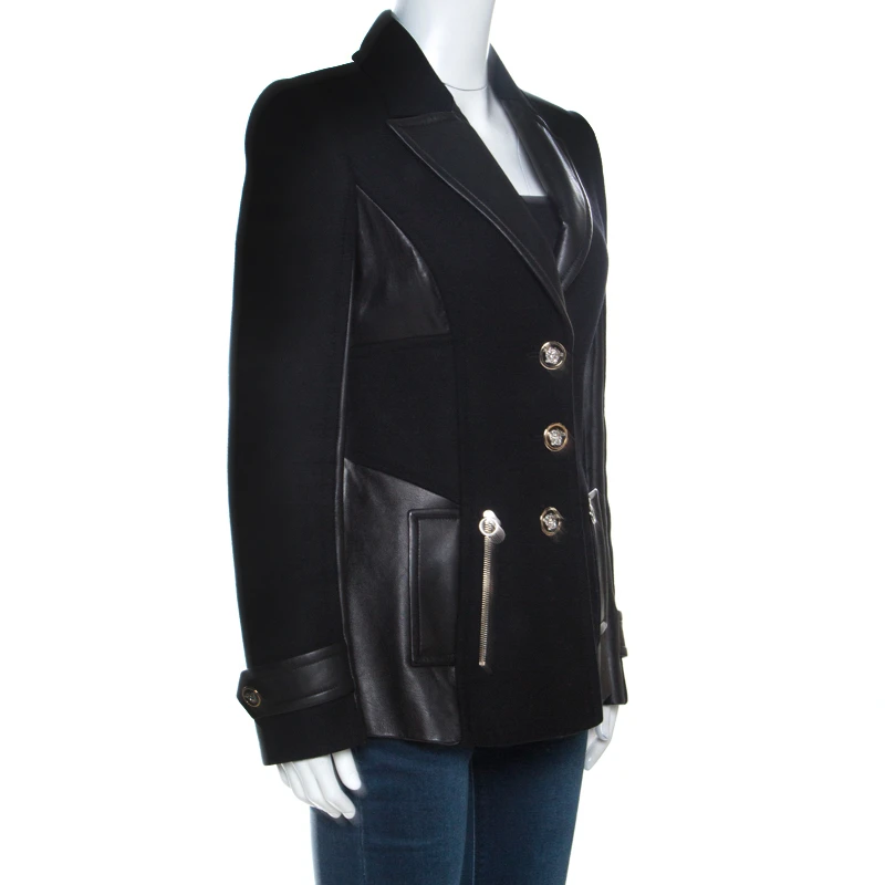 Versace gives us this tailored jacket as the perfect counterpart to team with trousers or dresses. Crafted from wool and leather, it has a structured silhouette. It is styled with a button front, long notched lapels, four pockets, long sleeves, leather trims and panels and a good fit.