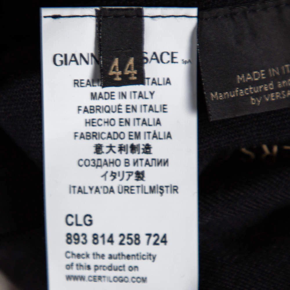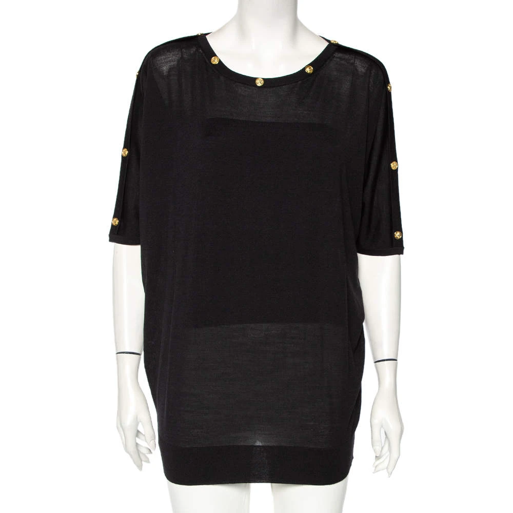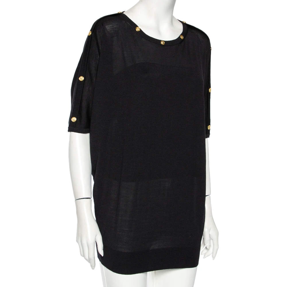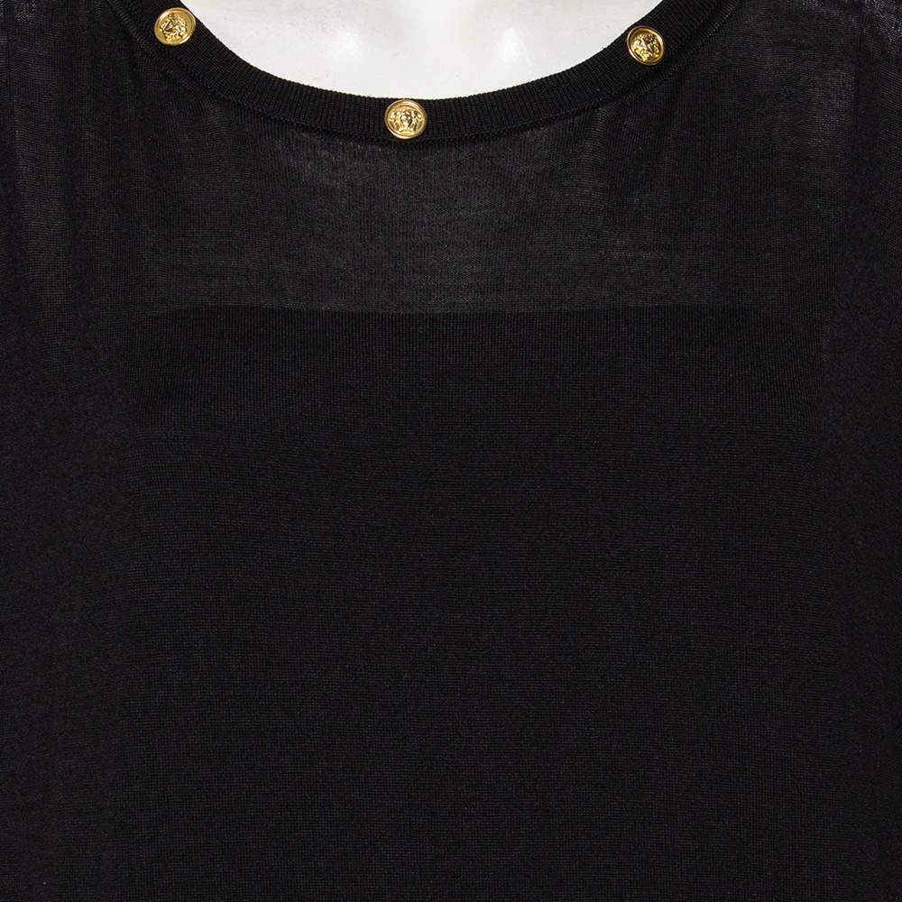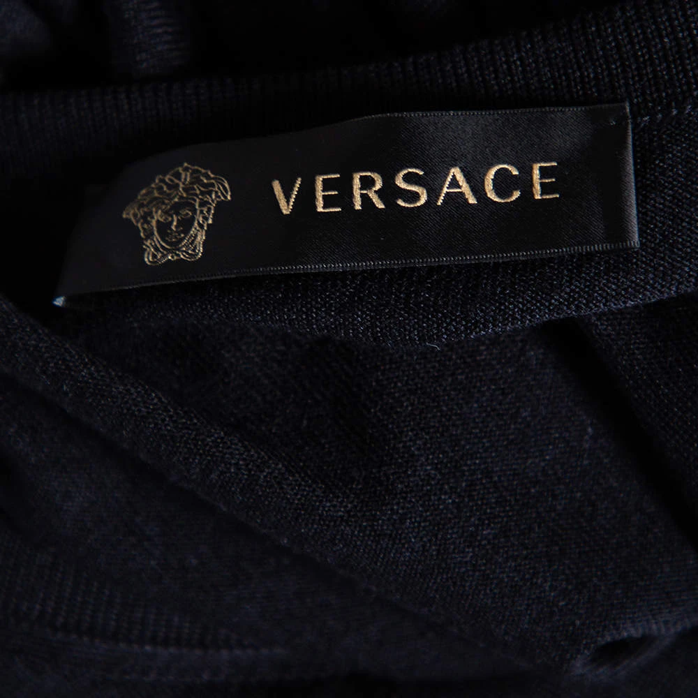 This stylish top by Versace is effortless and can be dressed up instantly. It has a black woolen exterior, an oversized shape, and gold-tone Medusa motifs on the neckline.