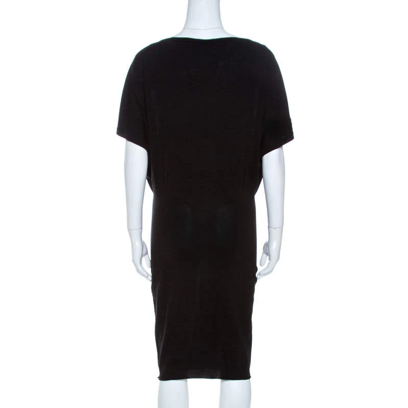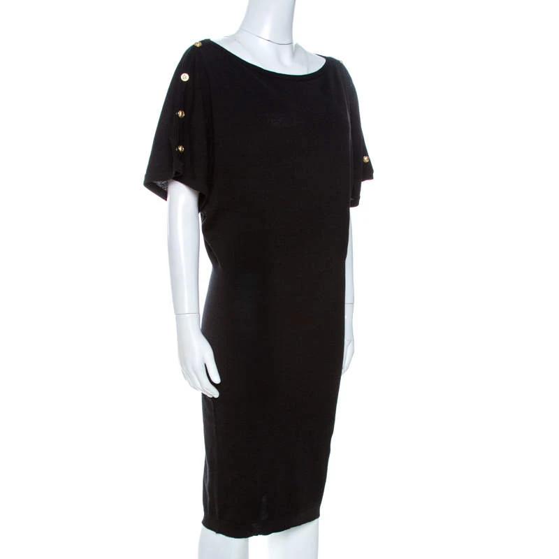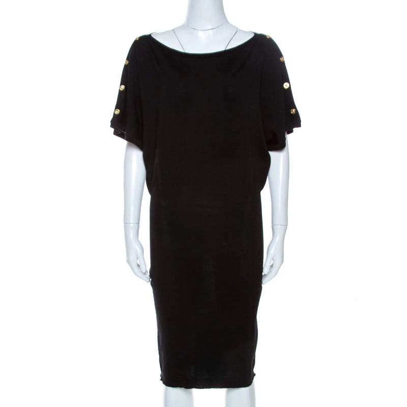 Grab this stunning dress by Versace now. Crafted from 100% wool, it comes in a lovely shade of black. It is stylish, elegant and very versatile. It is styled with loose short sleeves with gold-tone buttons, a simple wide neck and a fitted skirt with a hemline that grazes the knees. Wear for casual outings with friends.