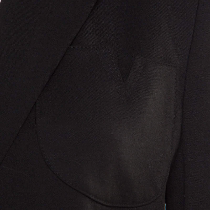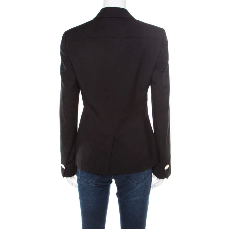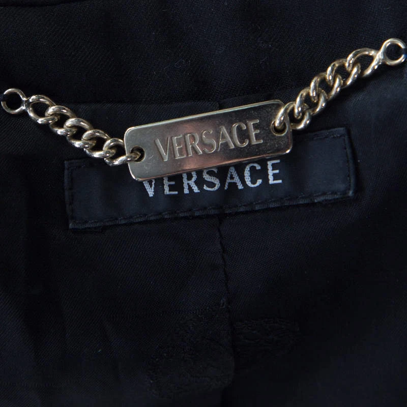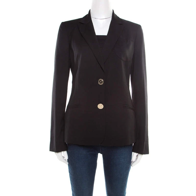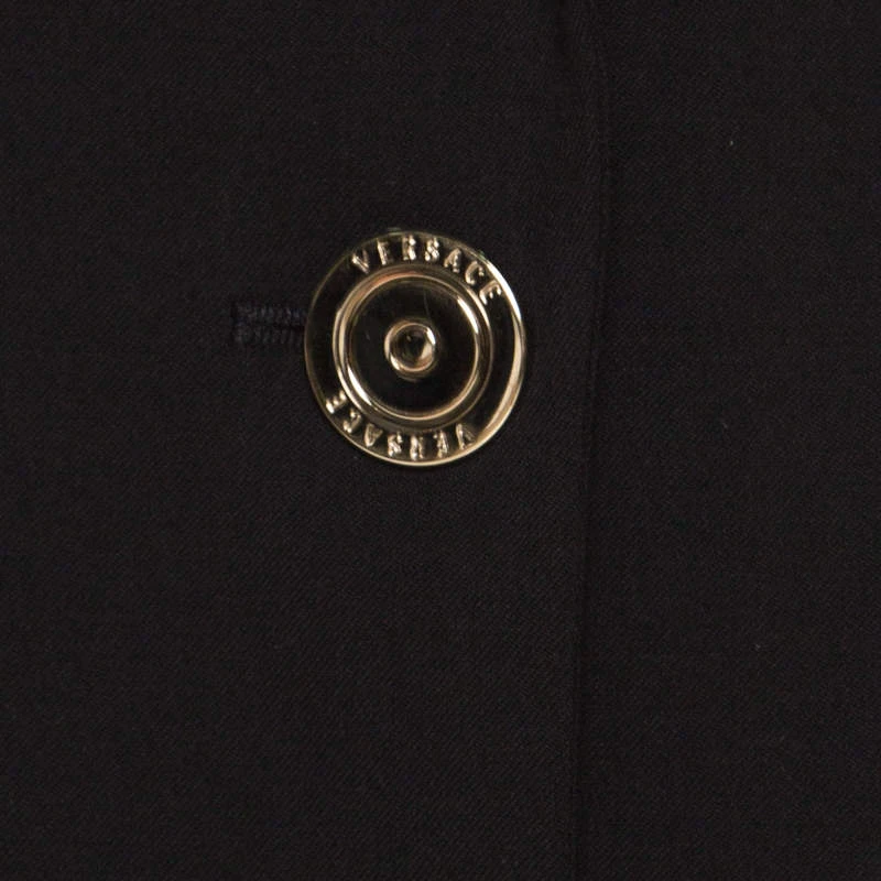 The sophisticated blazer from Versace offers comfort without compromising on style. The gold-tone logo buttons add a lovely touch to the amazing piece. Tailored from wool, this black blazer can be worn with trousers or over a dress.