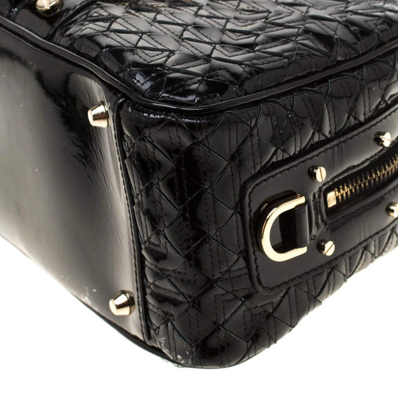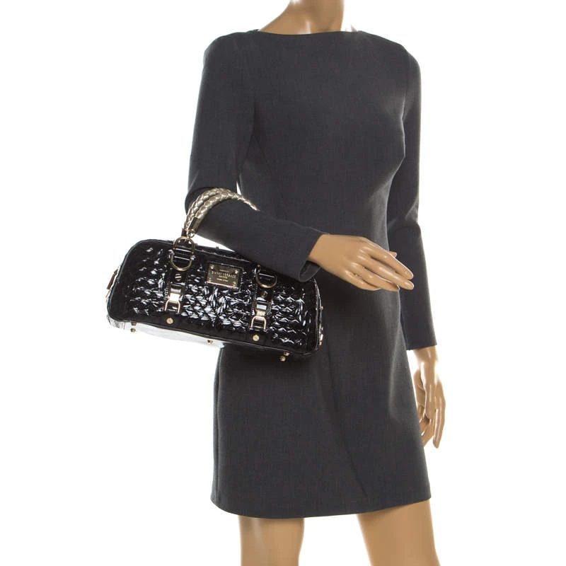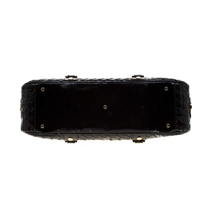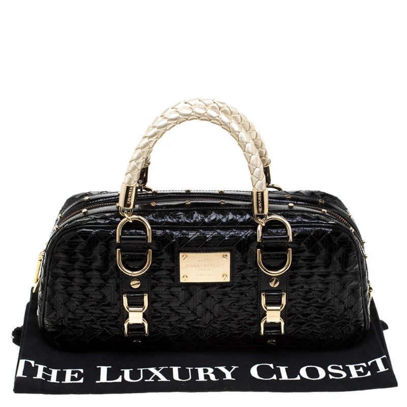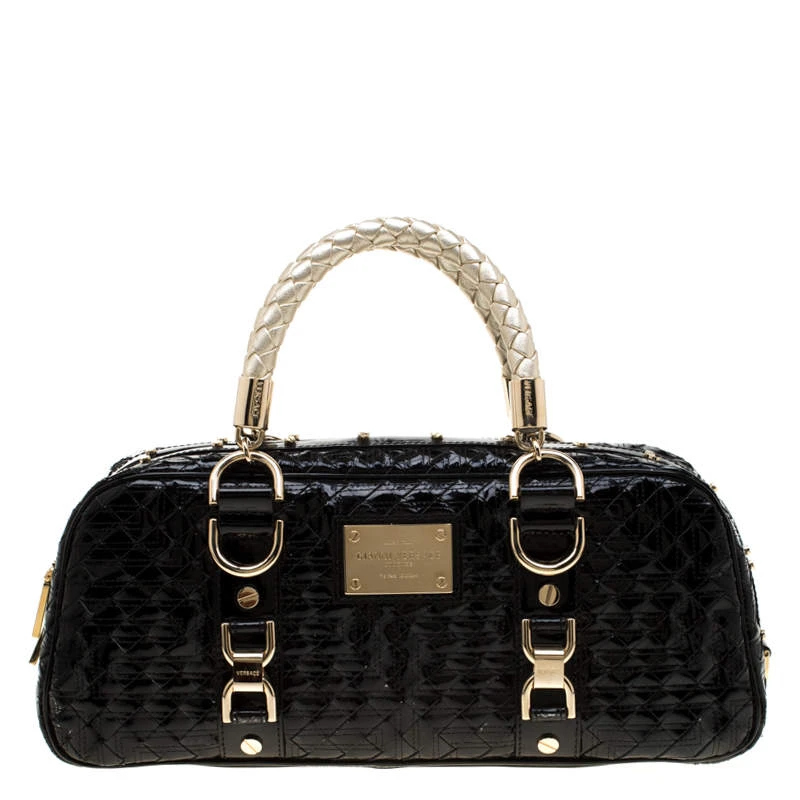 Woven to perfection, this Versace ‘Snap Out Of It’ satchel is in patent leather. It features dual braided top handles, gold-tone hardware, buckle detailing and the metal brand plaque on the front. The top zip closure opens to a fabric-lined interior housing enough space to store your necessities. The satchel is complete with protective metal feet.
