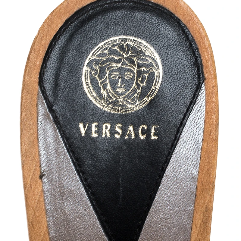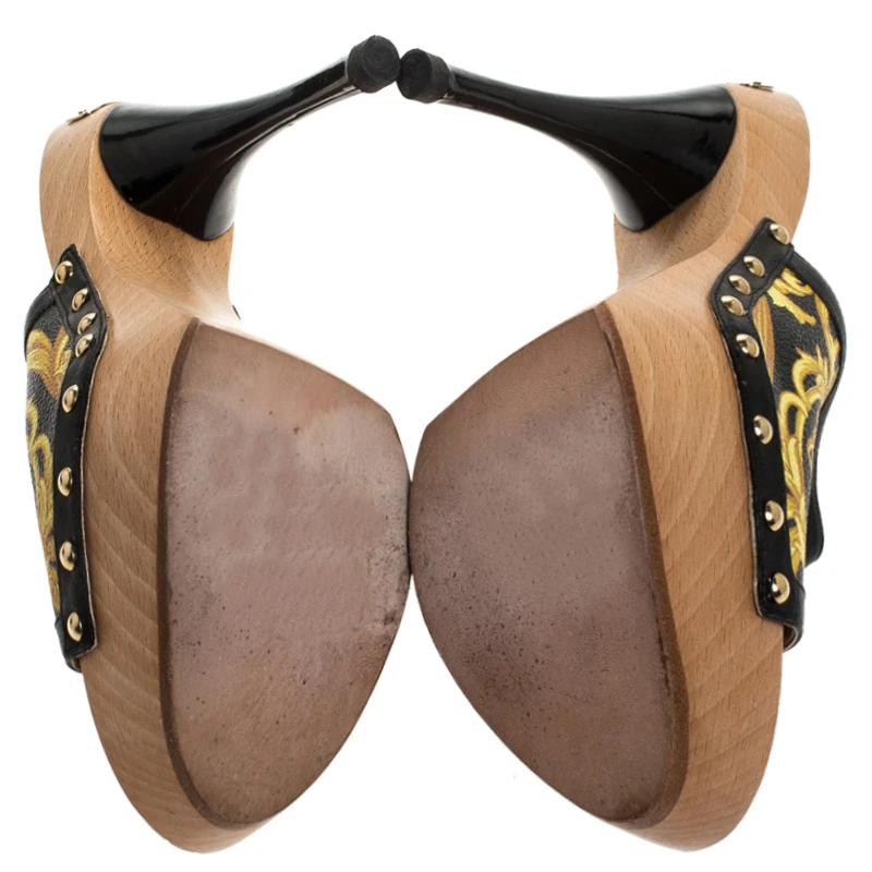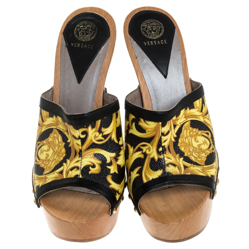 These platform clogs from Versace promise to adorn your feet with utmost style! They are crafted from Barocco-printed leather and feature open toes. They are complete with 14 cm heels supported by platforms.