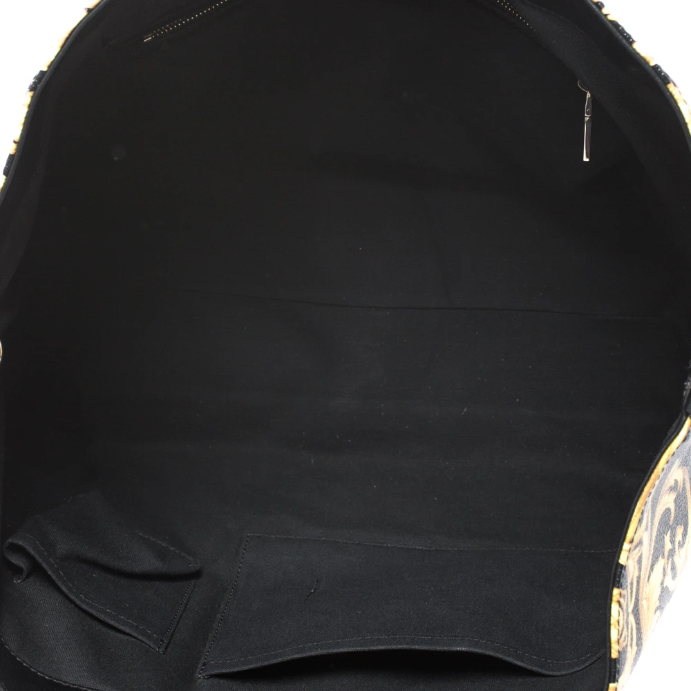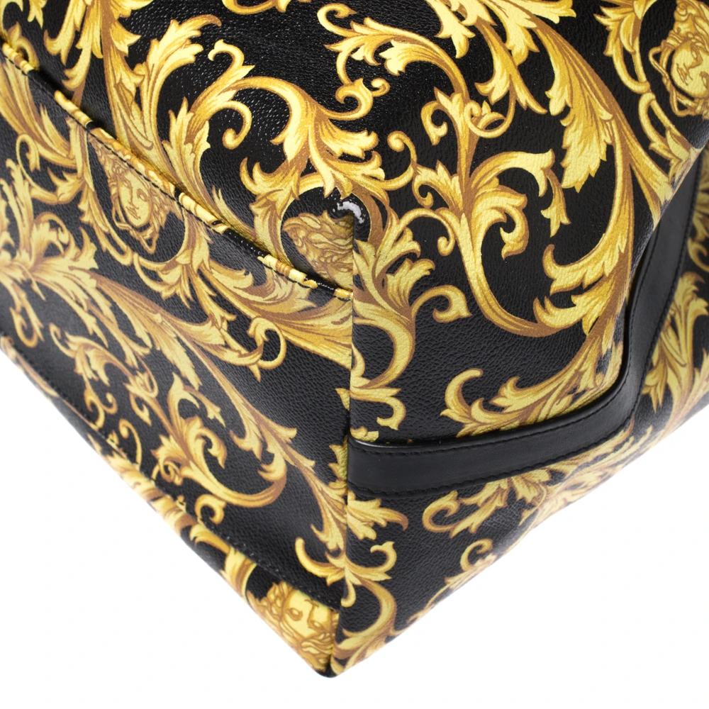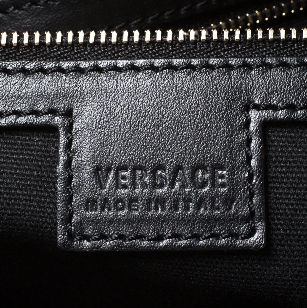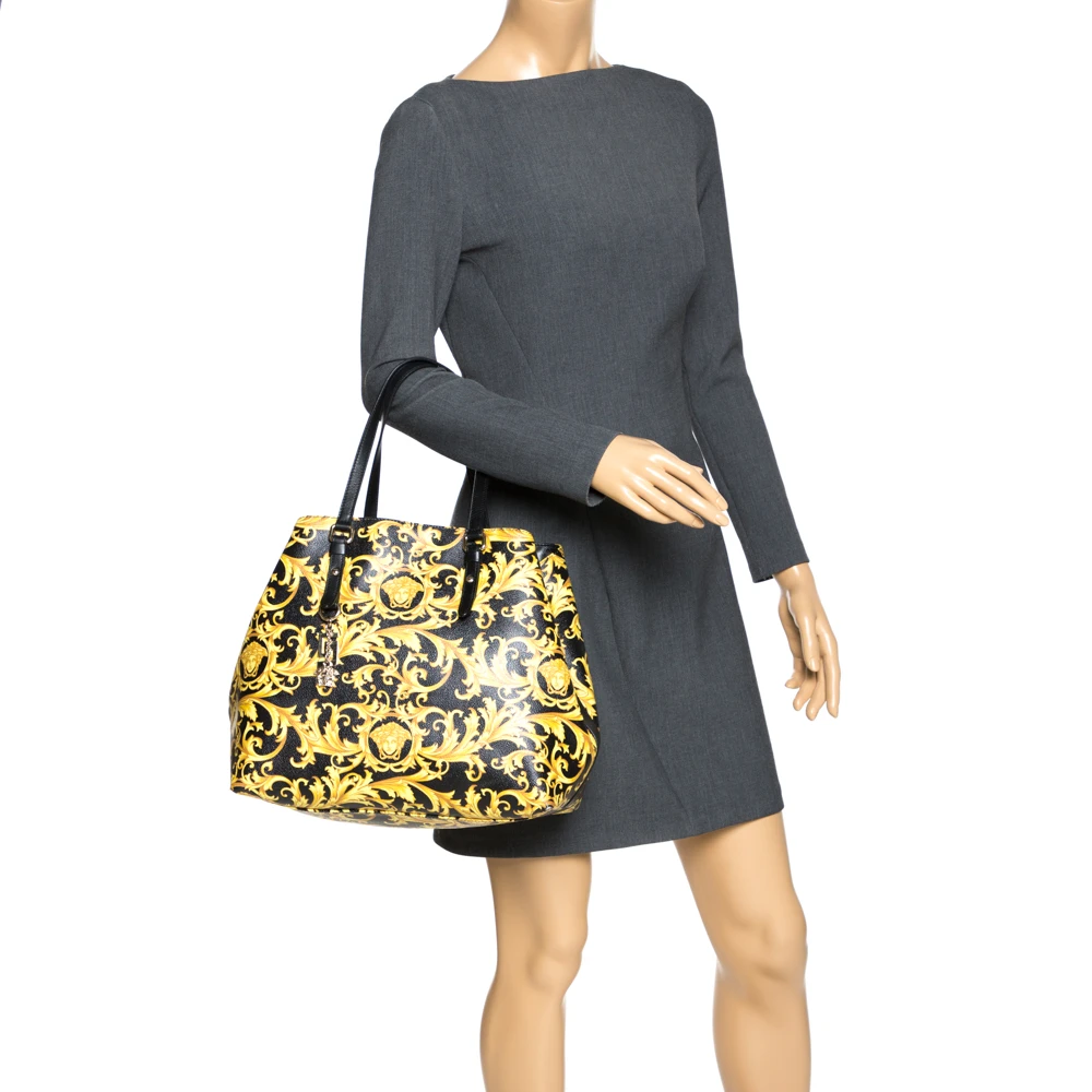 This Versace tote is made from black-yellow Borocco printed canvas with signature Medusa motifs. It boasts of an ultra-spacious canvas-lined interior that houses one zipped and two slip pockets. It is equipped with double leather handles for easy carrying experience and a gold-tone Medusa charm.