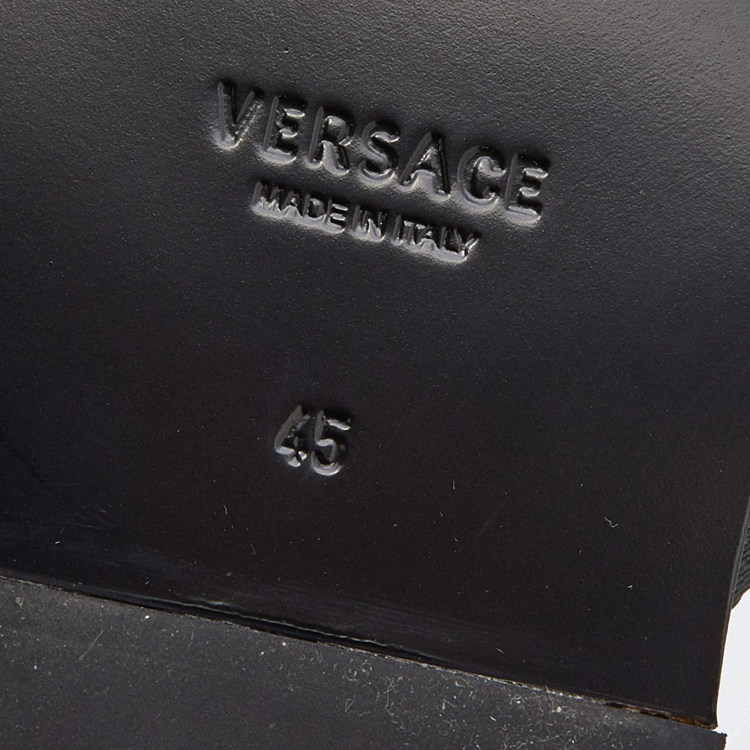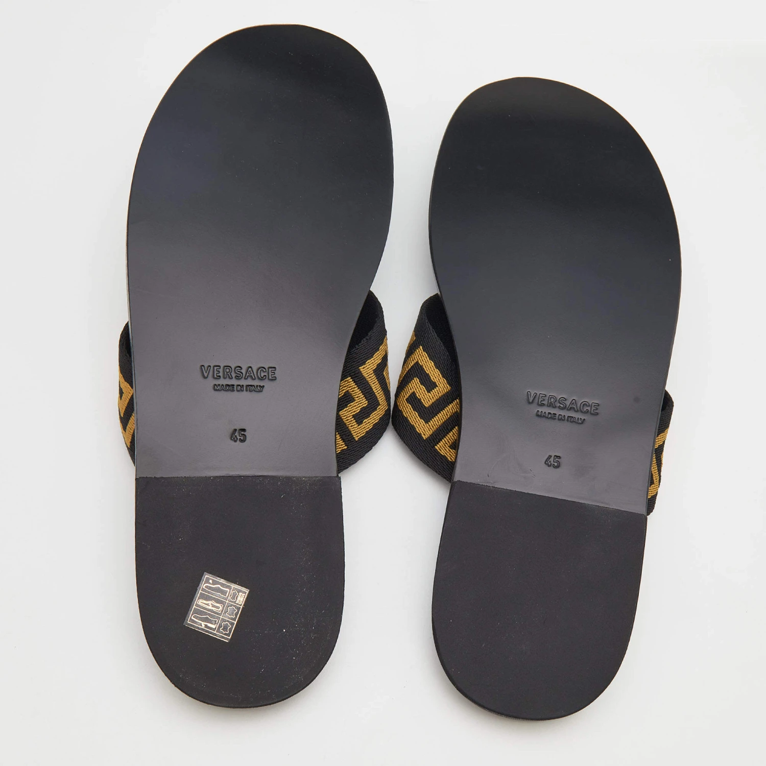Slip into these Versace sandals and experience comfort while you lounge around or go out to run errands. These flats have been crafted using leather with Medusa metal studs and fabric straps with Greca motifs.