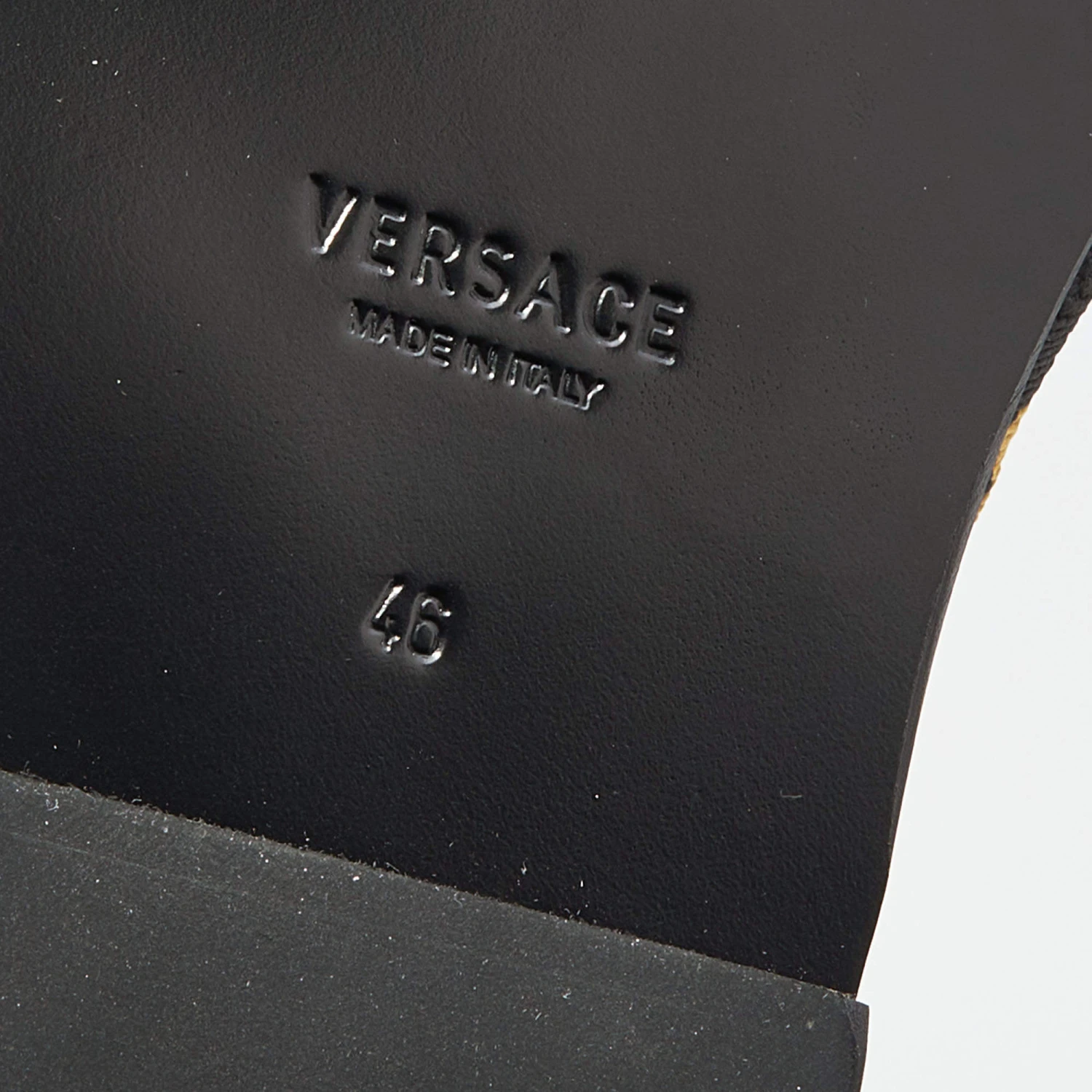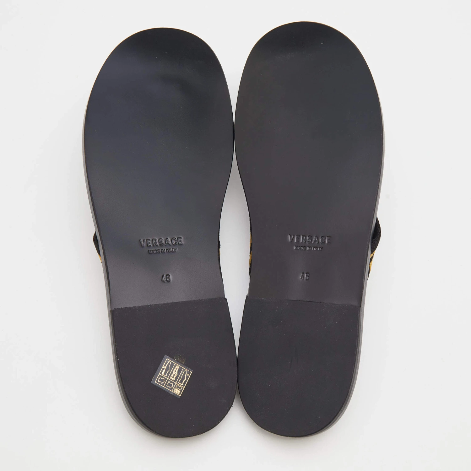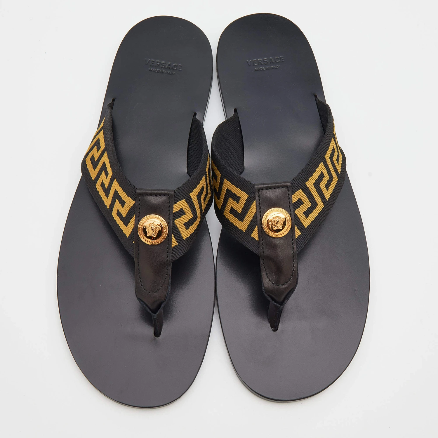 Slip into these Versace sandals and experience comfort while you lounge around or go out to run errands. These flats have been crafted using leather with Medusa metal studs and fabric straps with Greca motifs.
