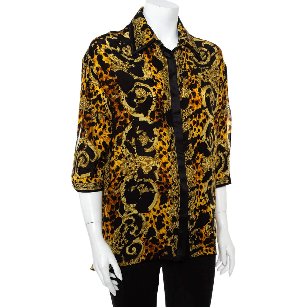 This artsy shirt from Versace is crafted from the finest quality silk. The full-sleeved shirt has the signature print in black and yellow shades throughout. Pair it with plain trousers or skirt.