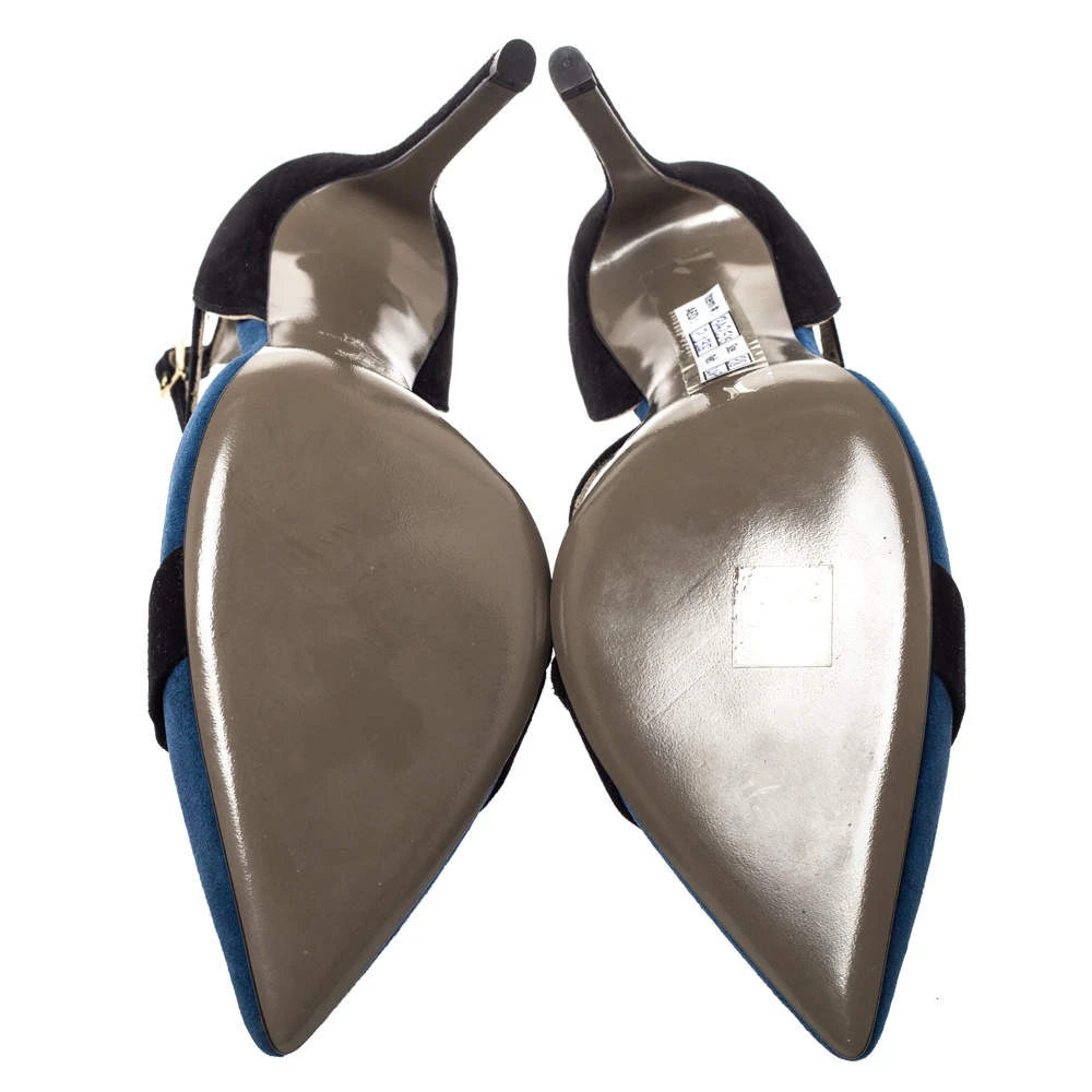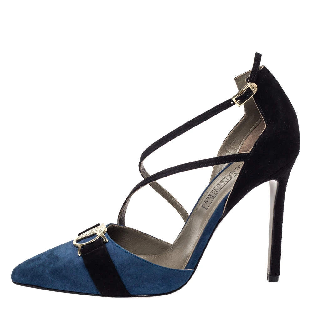 These Versace pumps have been styled to deliver style and sophistication. Crafted from quality suede, they come in lovely hues of blue & black. They have covered counters, strappy silhouette and buckled closures. The pointed toes are highlighted with the Medusa logo in gold-tone. They are finished with 11 cm heels.