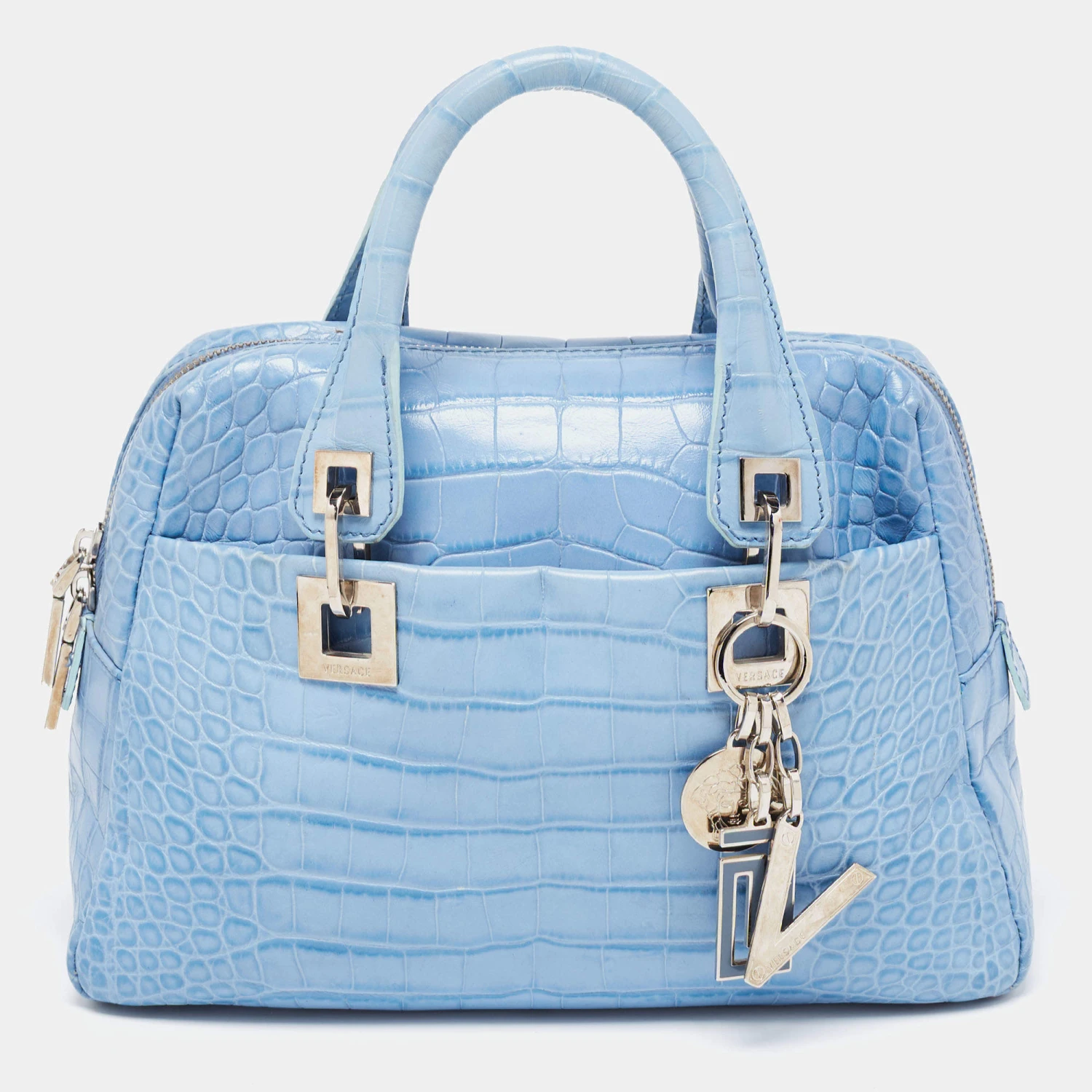 Designed into an architectural shape, this Versace satchel will infuse a touch of luxury into your outfit. It is held by dual handles at the top and it is adorned with branded charms. Created from croc-embossed leather, it flaunts silver-tone hardware, a fabric-lined interior, and a top zipper closure.