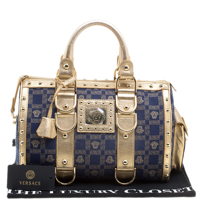 How gorgeous is this satchel from Versace! It carries an outstanding design and a fabulous interplay of blue fabric and gold leather. It has a top leading to a fabric interior while being held by two top handles. The signature prints and the brand logo on the front just uplift its beauty and makes it a buy you will not regret.