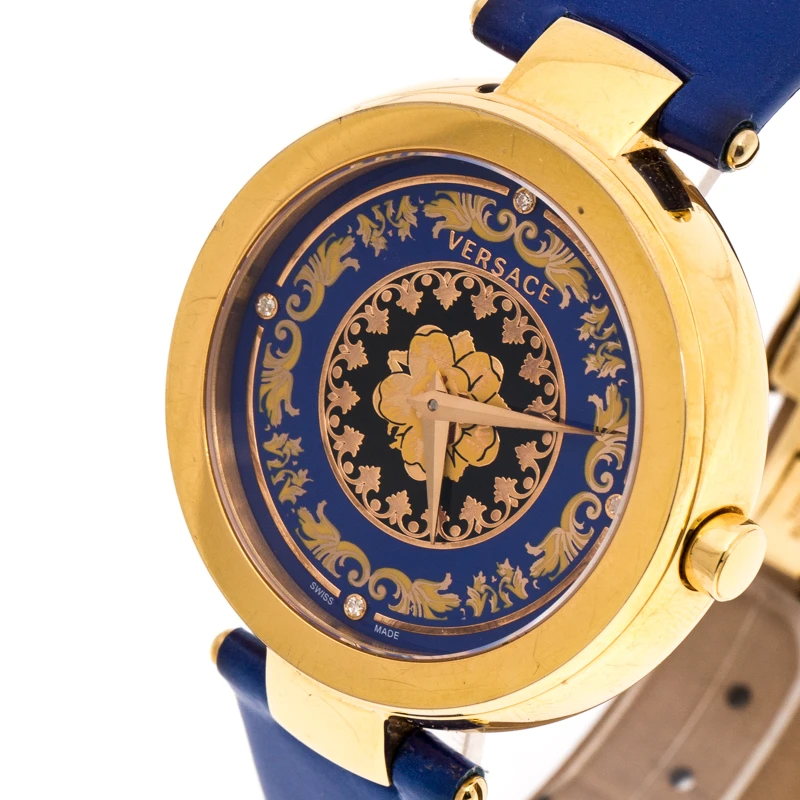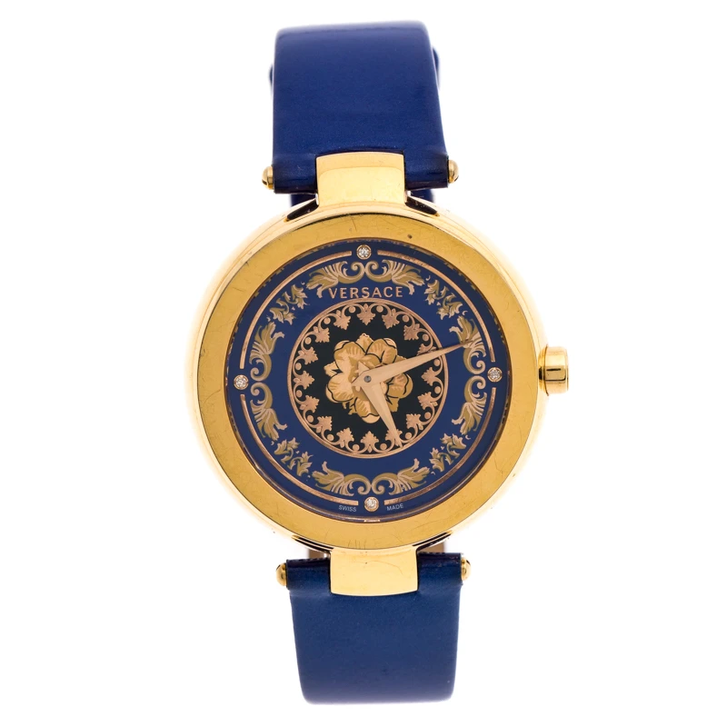 This beautiful timepiece from the house of Versace is sure to be a conversation-starter with its eclectic and eye-catching design. Constructed using gold-plated stainless steel, this Mystique Foulard VK6020013 watch features a beautiful blue dial lit with lovely patterns. The case is elegantly held by leather straps and fastened with a simple clasp.