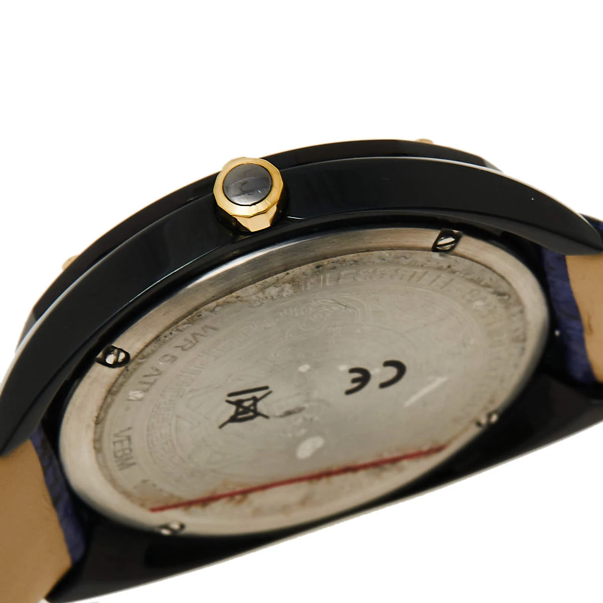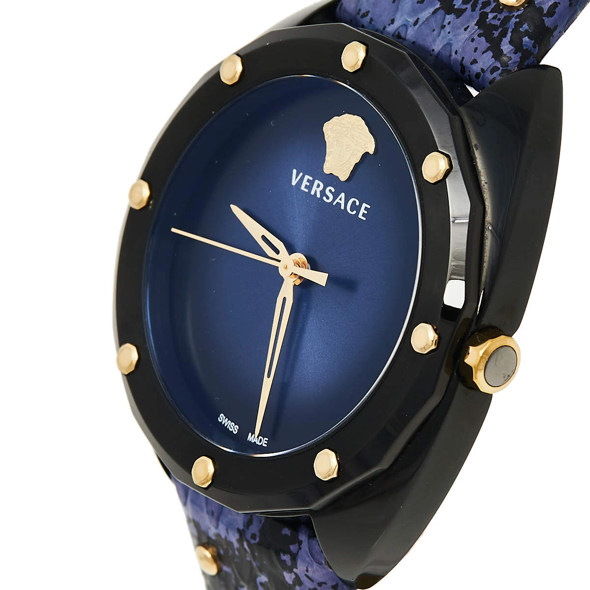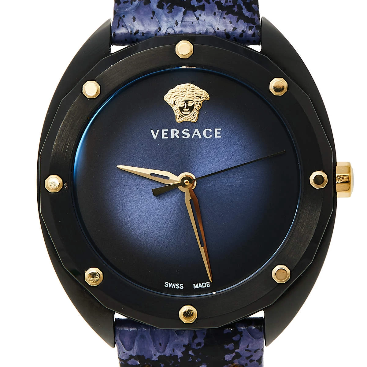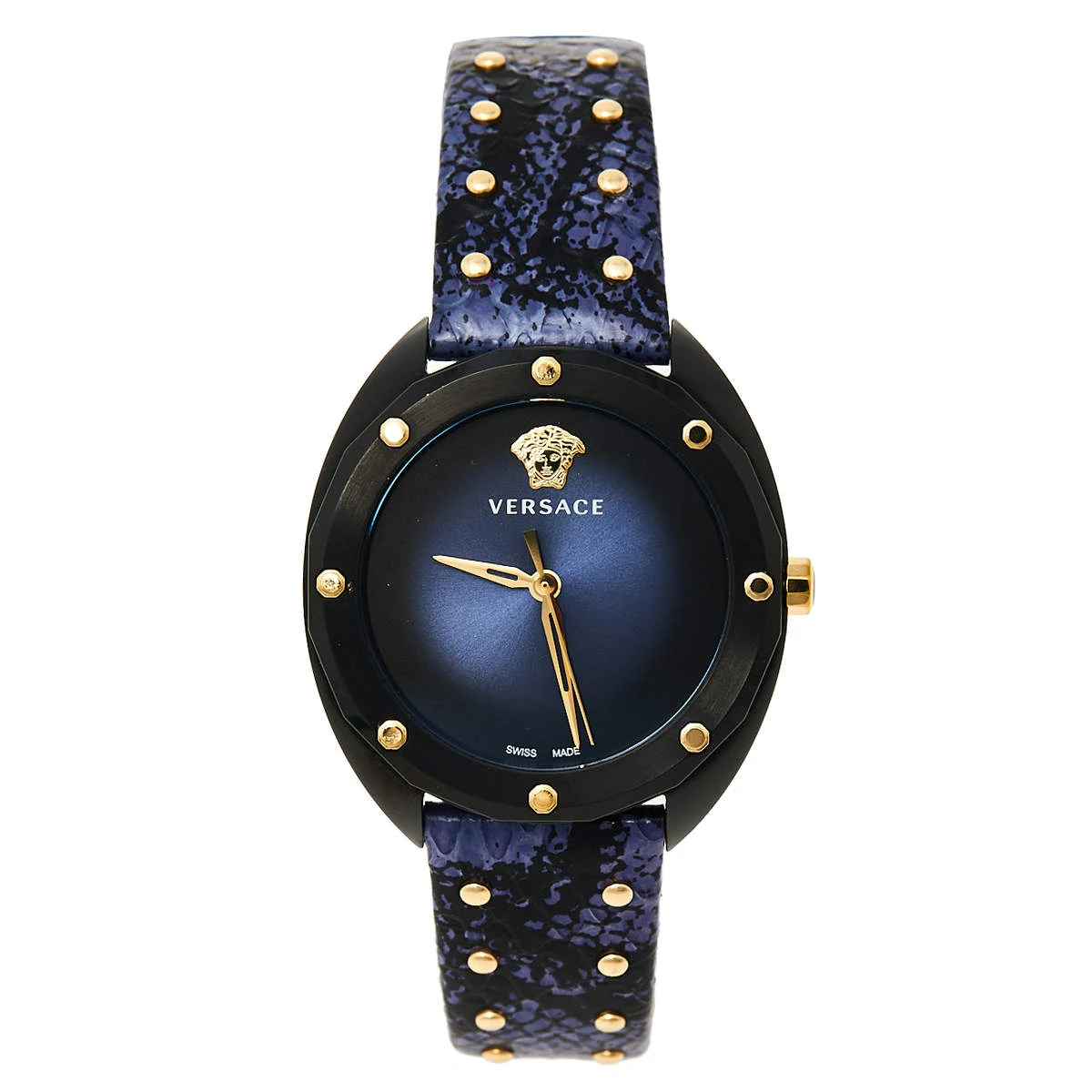 Simple, elegant, and sophisticated, this Versace Shadov watch will give your everyday outfits a feminine look. Made from ion-plated steel, the 38 mm case comes with a blue dial featuring three hands along with the Medusa logo. The bezel and the bracelet are adorned with gold-tone stud embellishments. This 50m water-resistant watch is a must-have!