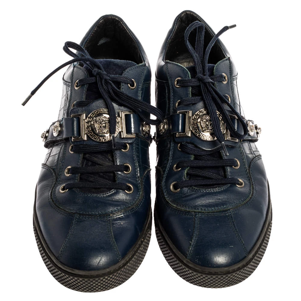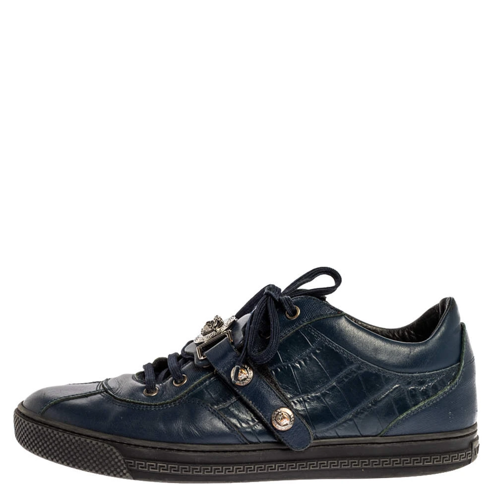 These leather sneakers are meant to lend a luxe twist to your outfit. Looking fashionable in your casuals is as easy as slipping into these blue sneakers. Designed by Versace, they feature the Medusa detail, croc embossing, lace-up vamps and rubber soles.