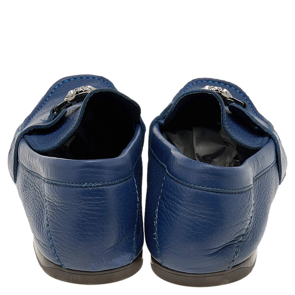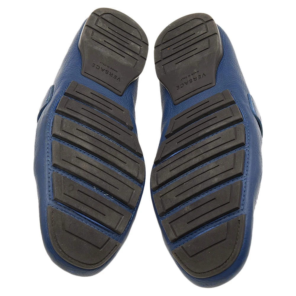 These loafers from the House of Versace are absolutely fascinating in appearance and design! They are made from blue leather on the exterior, with a gunmetal-toned Medusa embellishment perched on the vamps. They are made in a slip-on style.