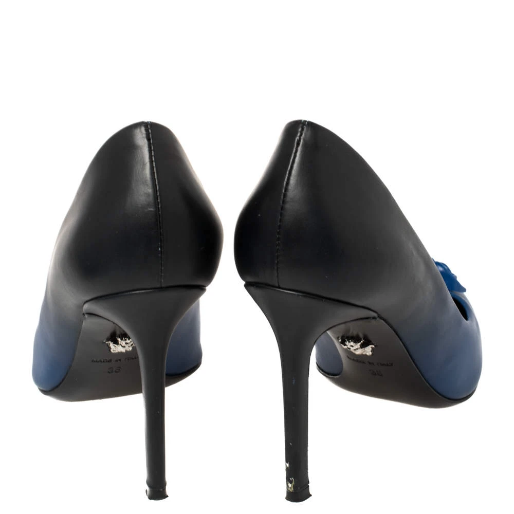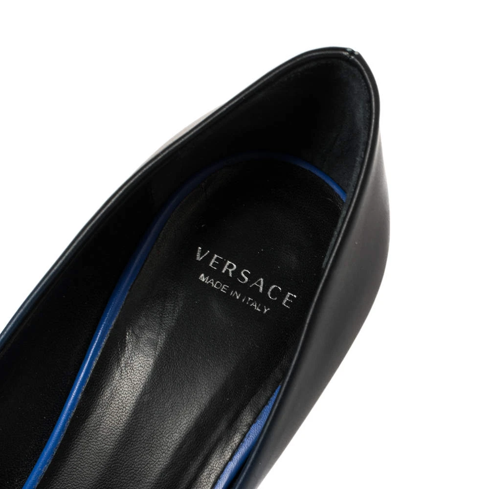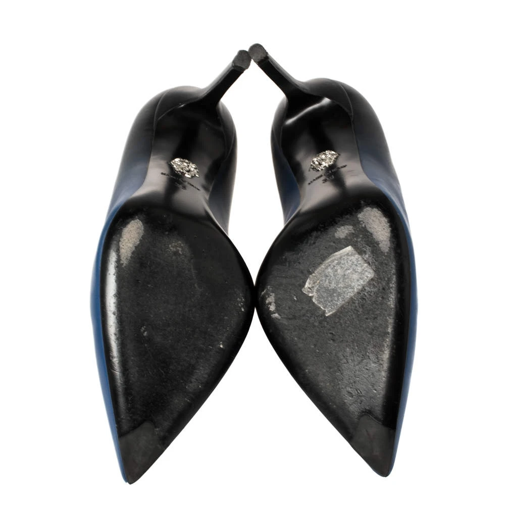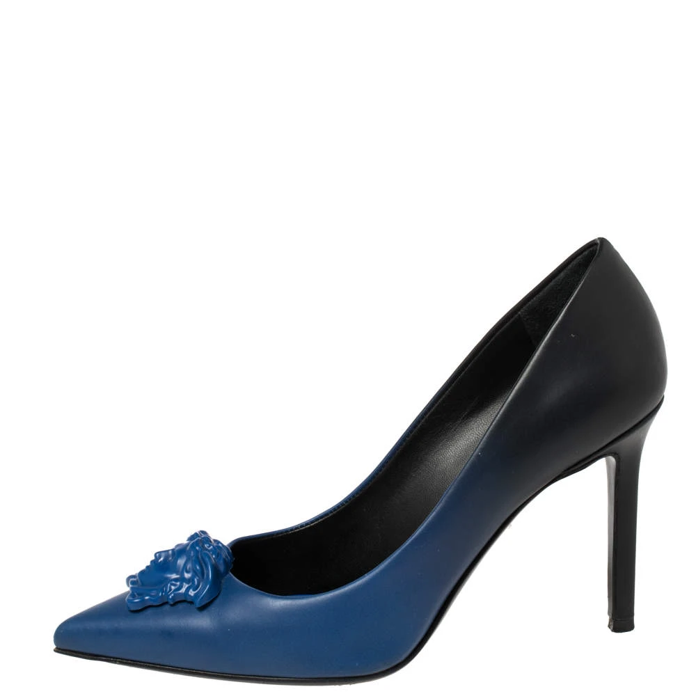 Incredibly stylish and statement-making, this pair of pumps from Versace is worth owning! The blue pumps are crafted from leather and feature pointed toes. They have been styled with the signature Medusa motifs on the vamps and come endowed with comfortable insoles. They stand tall on 9 cm heels.