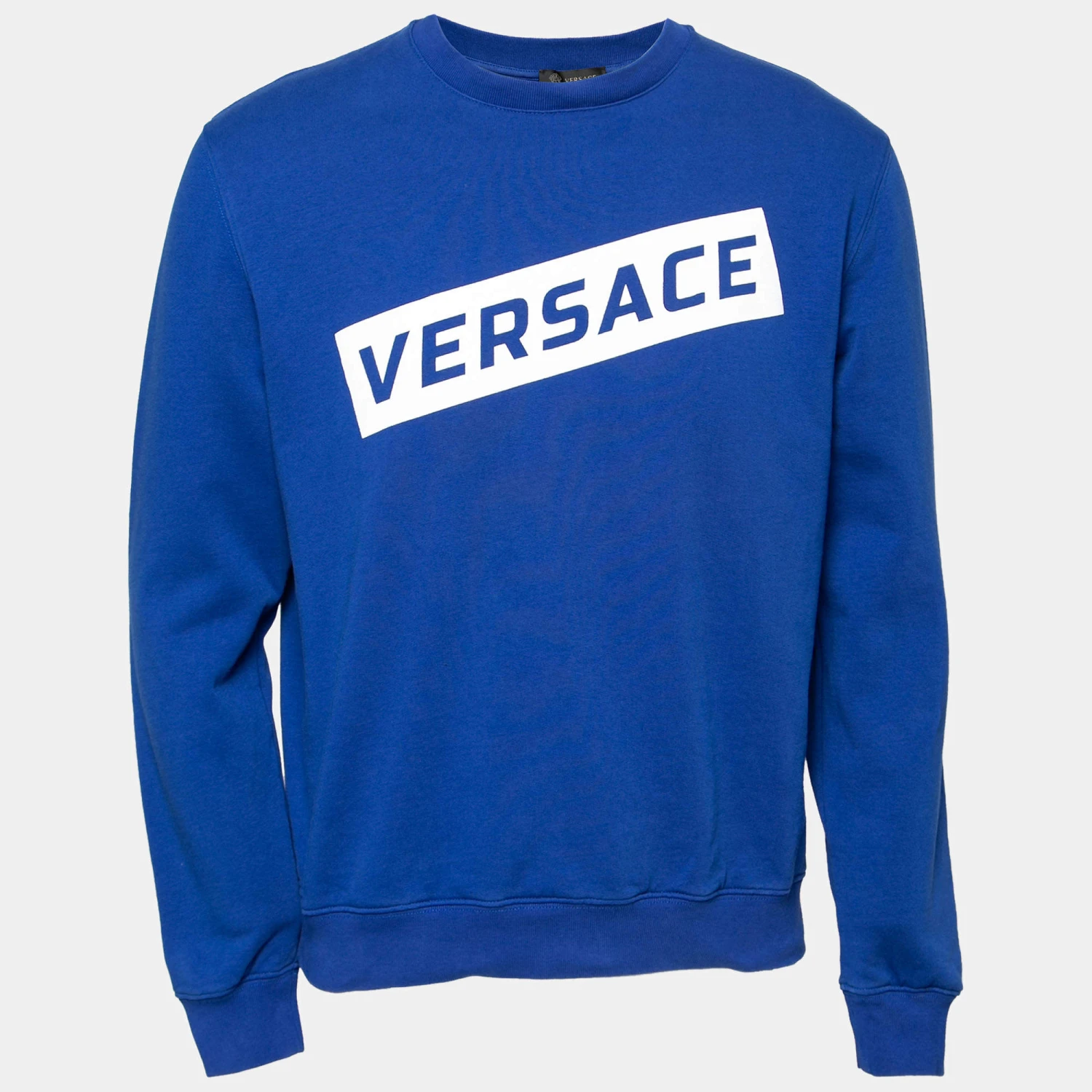 This sweatshirt from the House of Versace is all about sporting a classy and comfy style. It is tailored from blue cotton fabric, with a logo print adorning the front. It showcases a relaxed fit, a crew neck, and long sleeves. This sweatshirt is great for casual use and will make you look stylish.