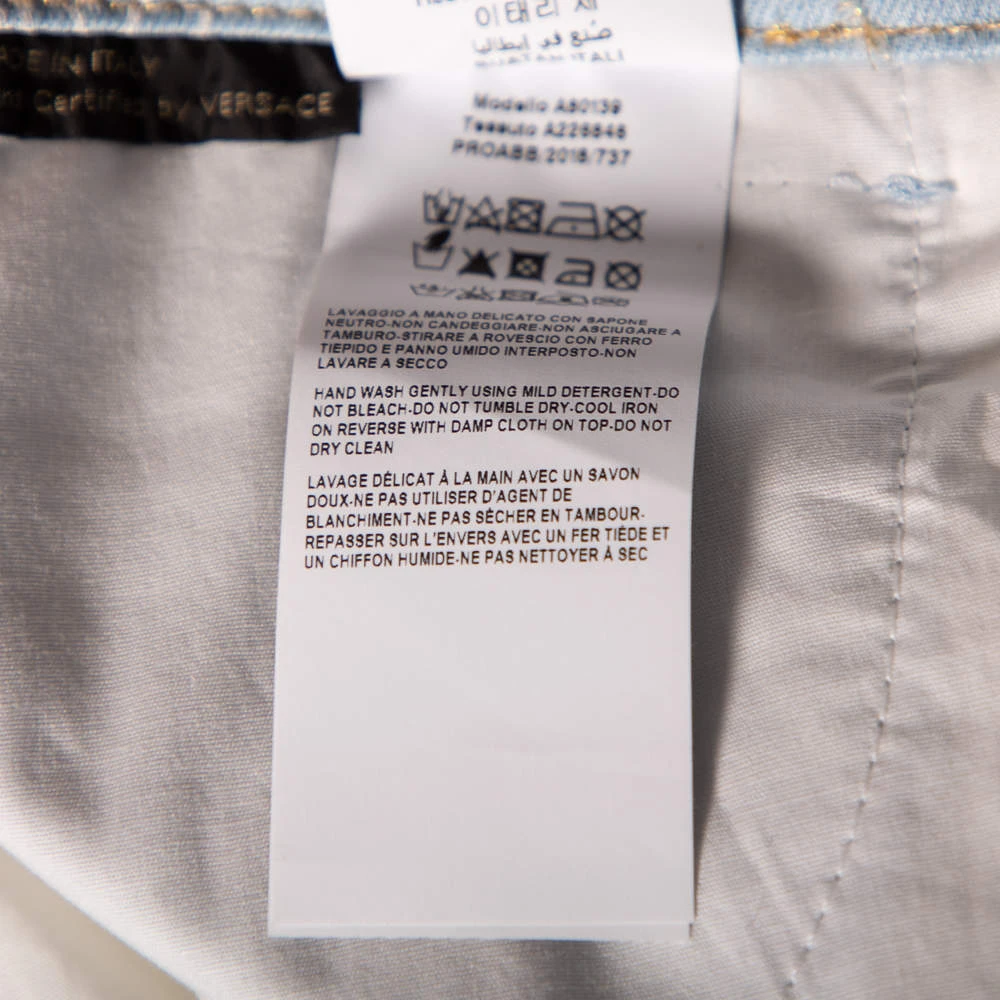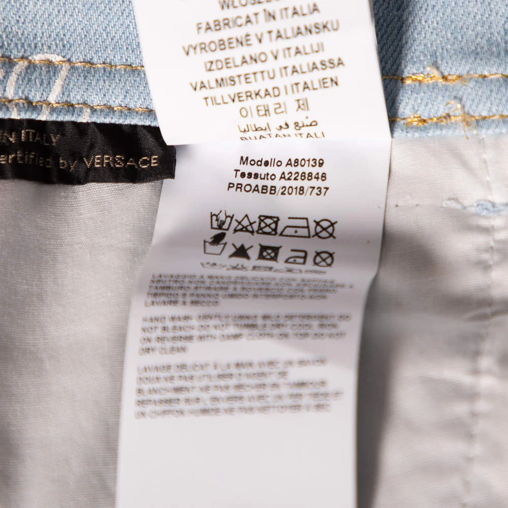 A wardrobe essential gets a luxe update from Versace. The pair of fitted jeans features logo prints, five pockets, belt loops, and front button closure. The blue denim jeans will offer ample comfort and style.