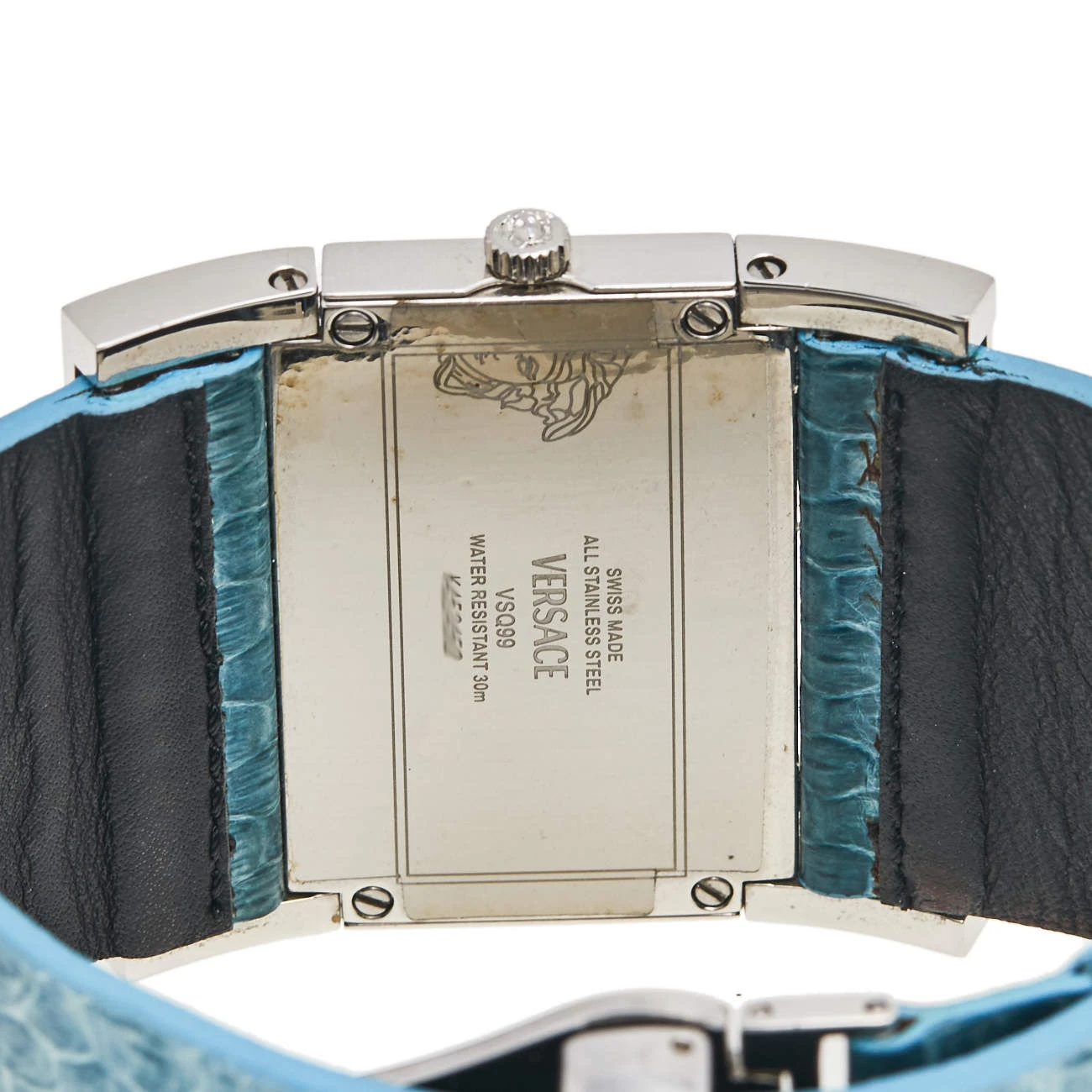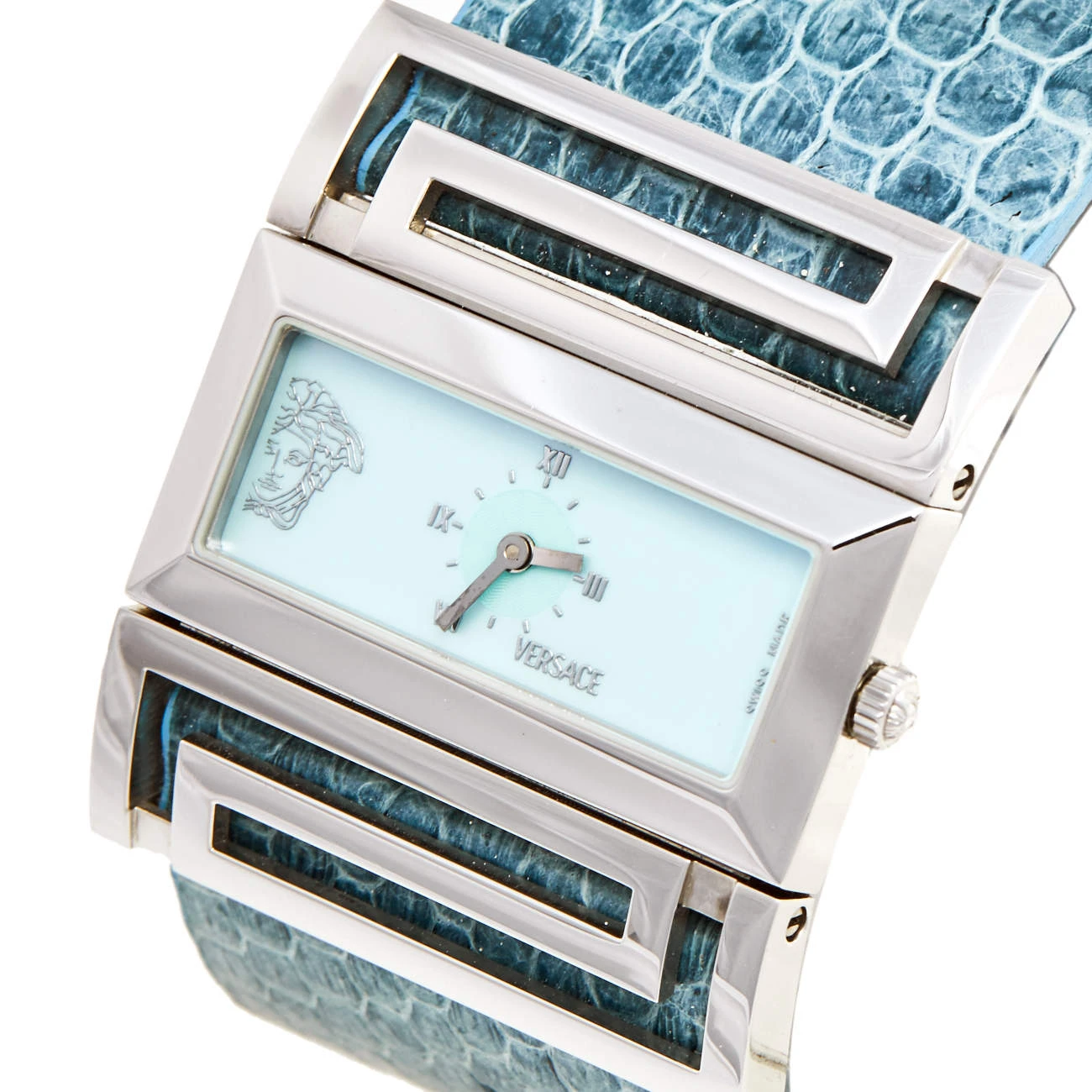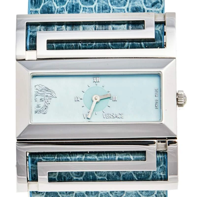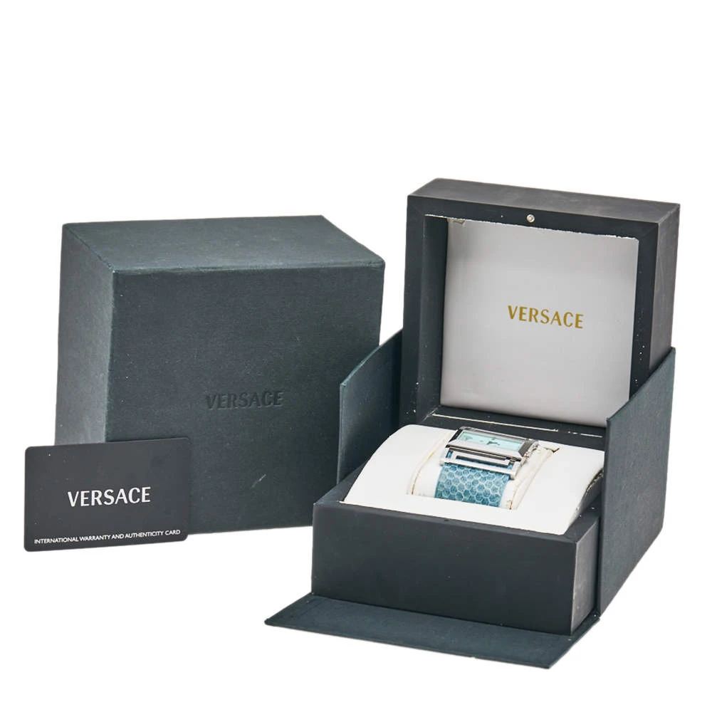 Stand out with this Versace Beauville wristwatch. Made from stainless steel, the rectangular case holds a smooth bezel and a mother of pearl dial packed with elegant details. The quartz watch has a wide bracelet in snakeskin leather.