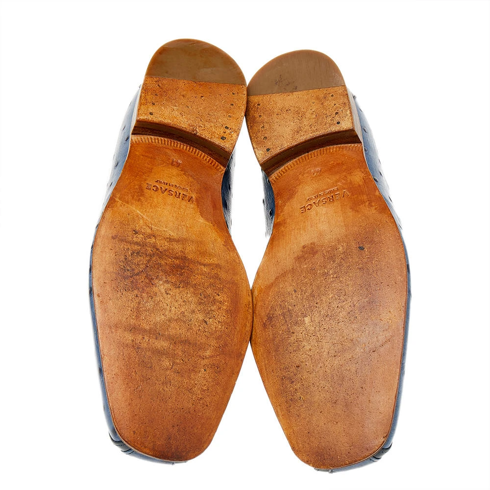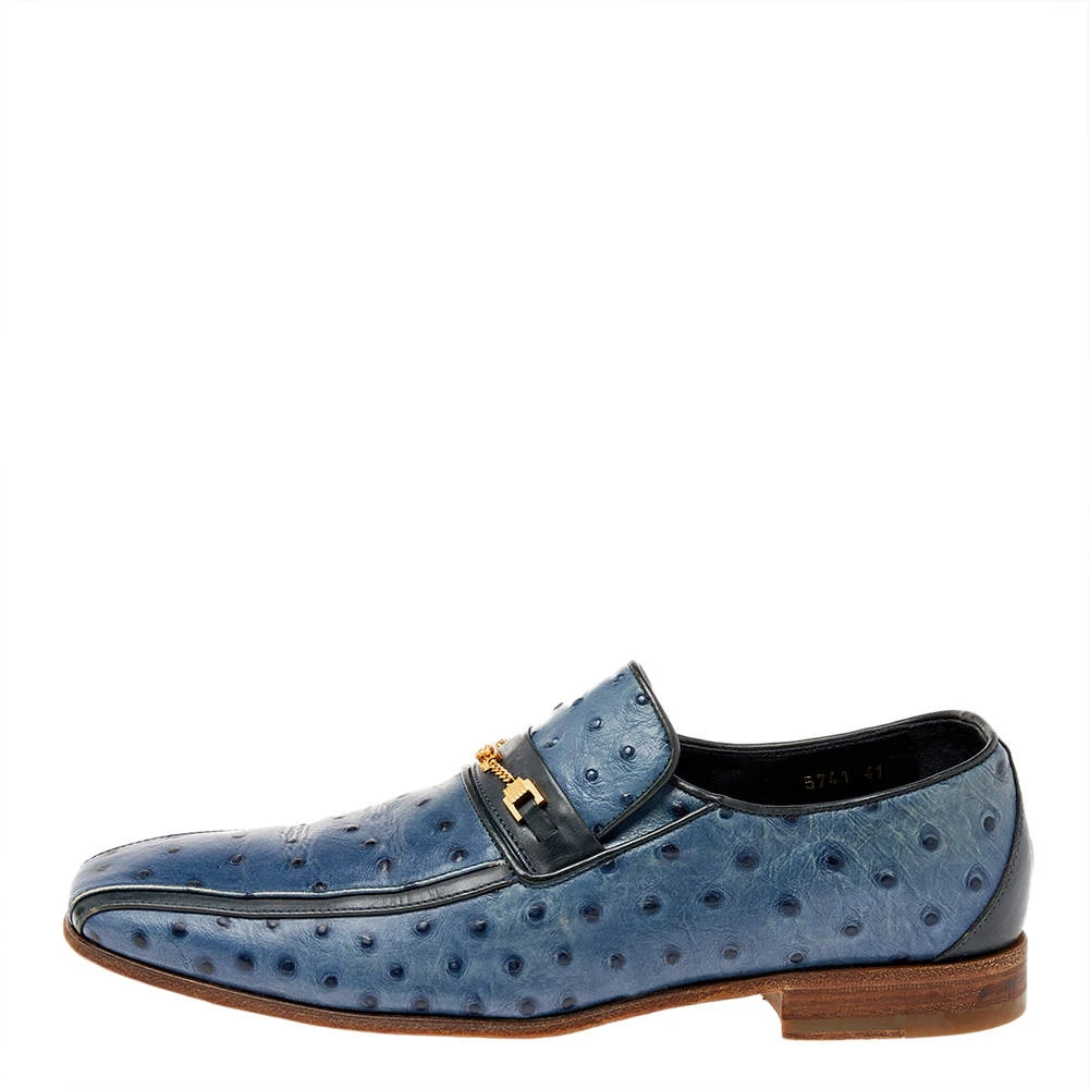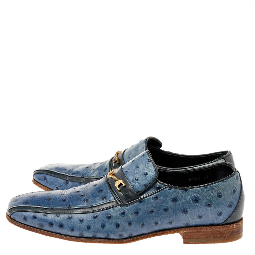 Known to incorporate signature motifs, these loafers designed by the House of Versace are high on appeal and functionality. Blue ostrich leather is used to craft the loafers into their desired shape, and the Medusa chain detail in gold-tone embellishes the vamps. These Versace loafers will surely complement your casual outfit well.