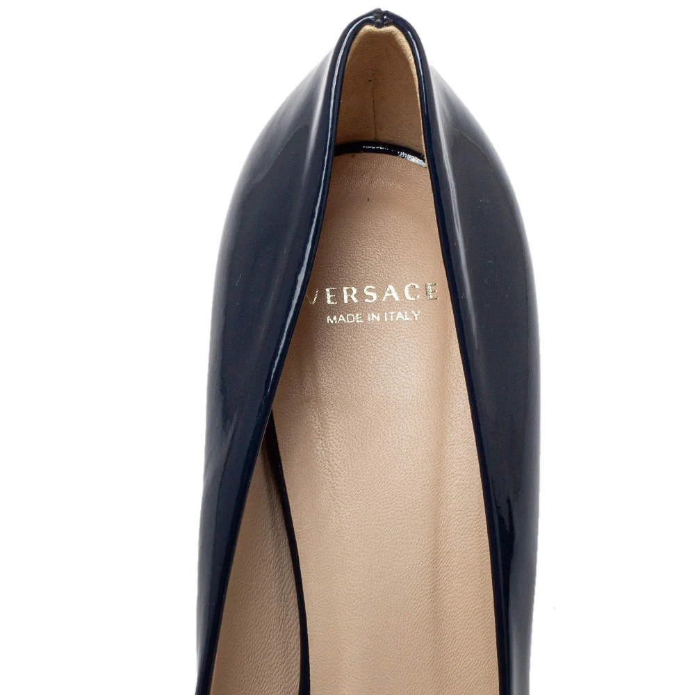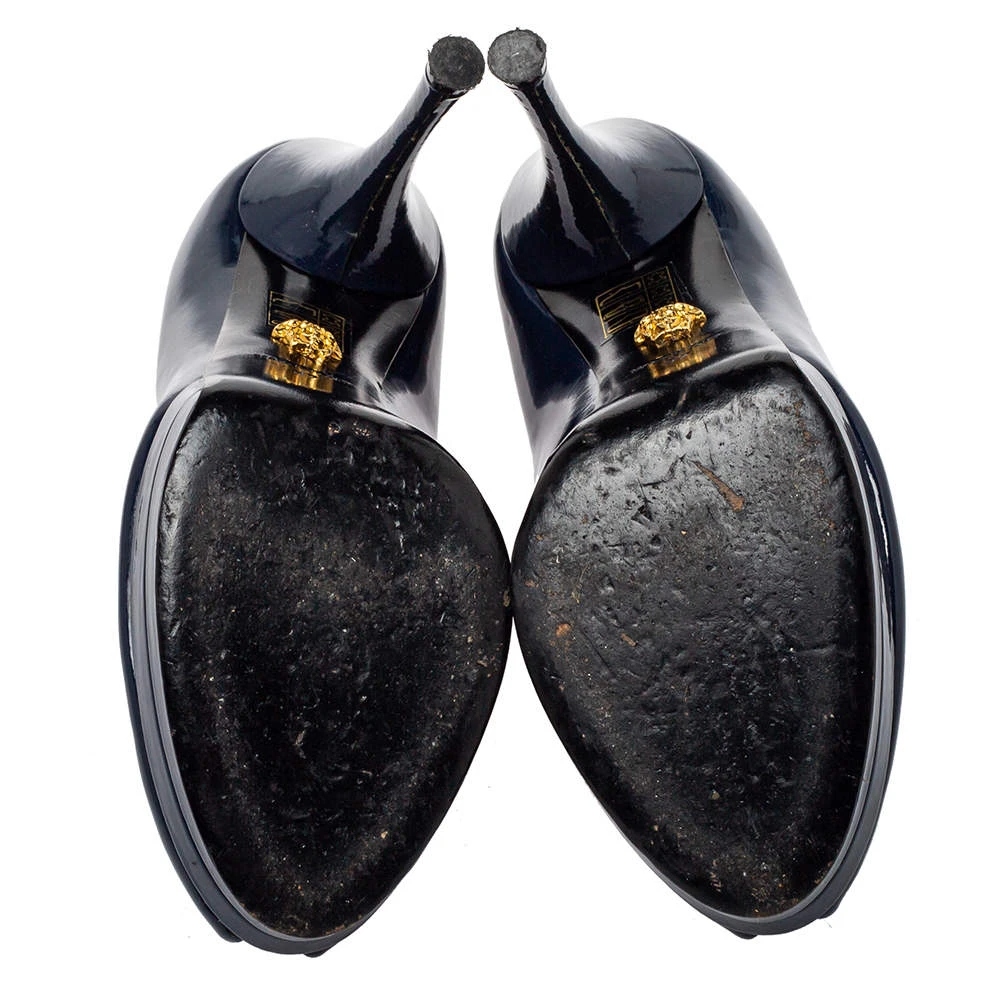 You can never go wrong with these pumps from Versace. Crafted from quality patent leather, they come in a lovely shade of blue. They are styled with peep toes, platforms, 12 cm high heels, and a sculpted top line. They are great for special occasions and are finished with leather soles.