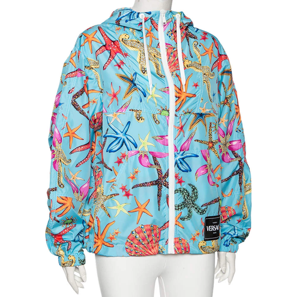 This jacket by Versace presents a fun style. It comes with colorful starfish prints laid on a blue exterior. This creation features a zipped front, pockets, and a hood. It has been cut to deliver a comfortable fit.