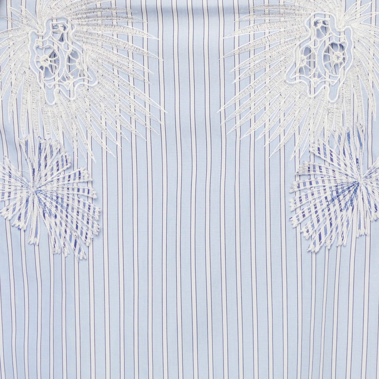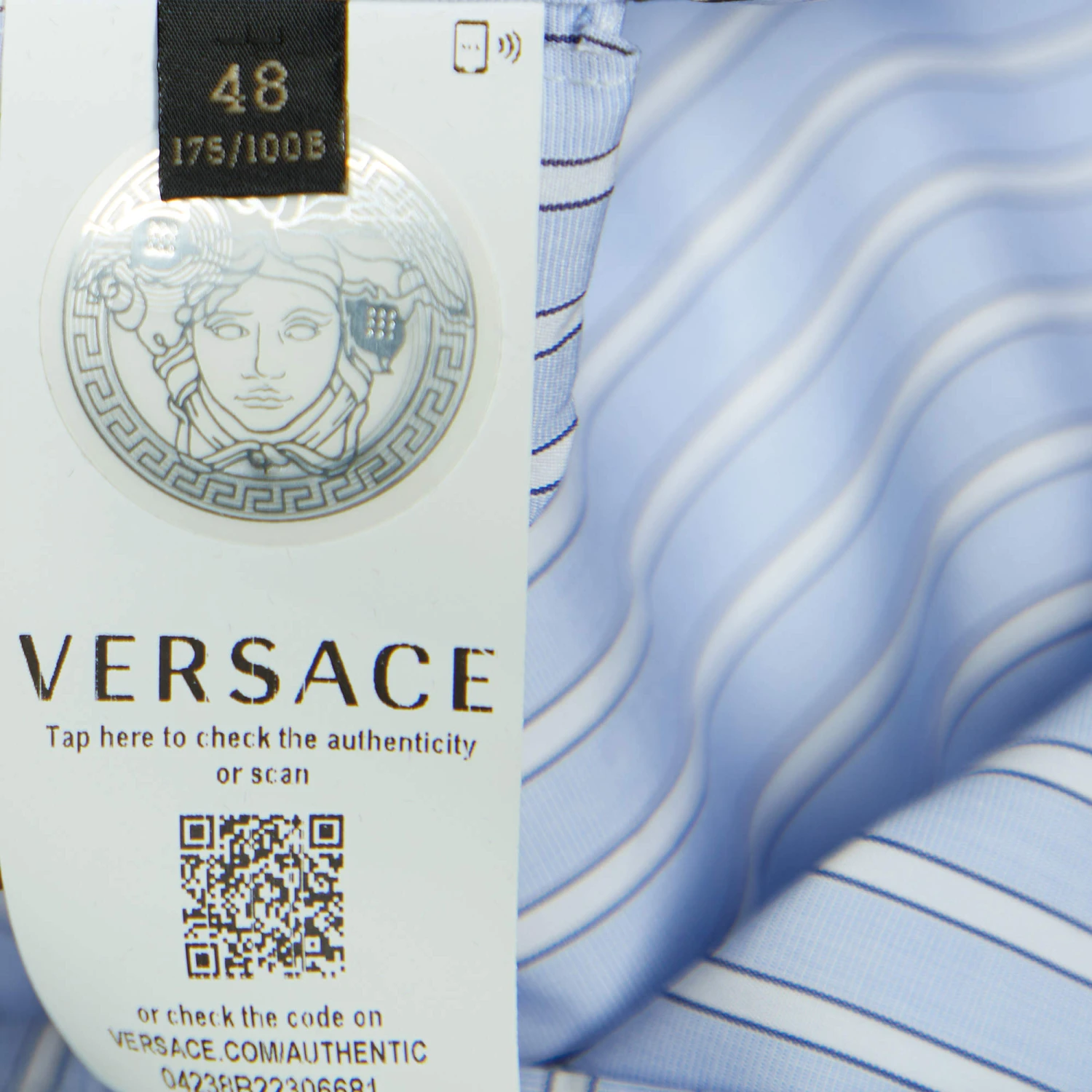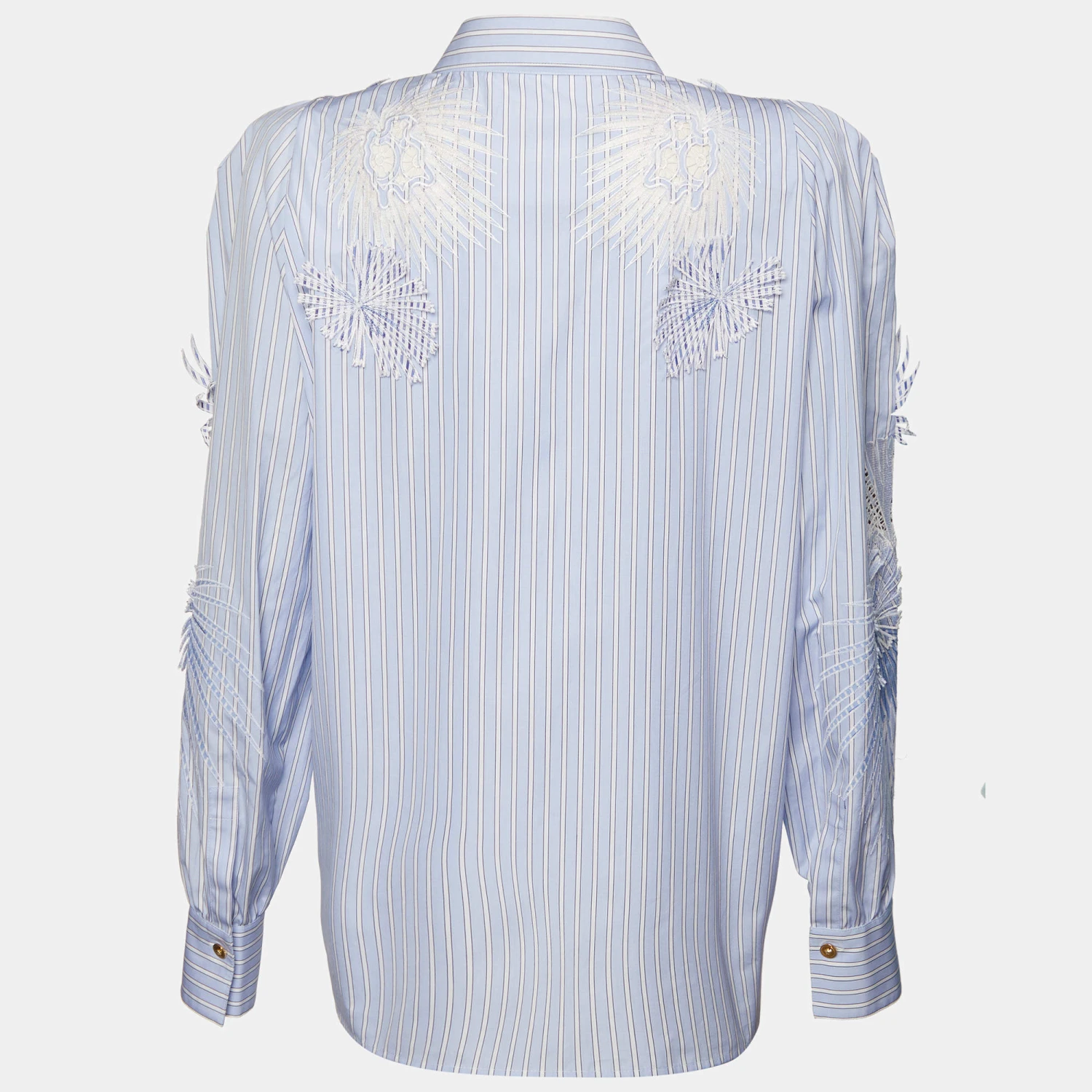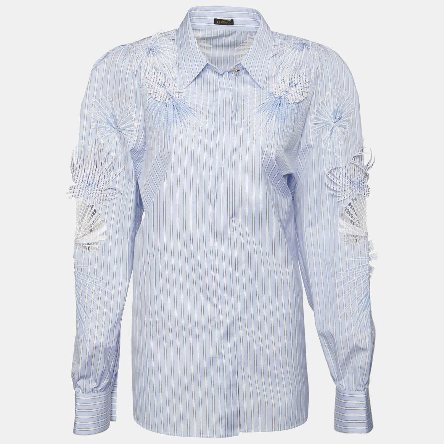 Create an elevated style statement by wearing this trendy shirt from Versace. It showcases a chic silhouette that is made from blue-striped cotton fabric and comes with long sleeves, buttoned closures, and collars. Beautiful floral appliques highlight it throughout. Team it up with black trousers to make a stylish impression.