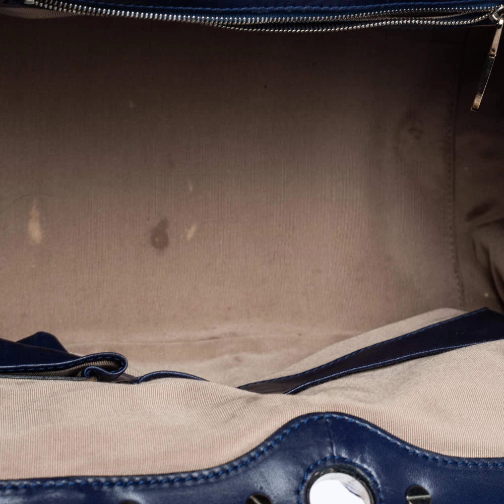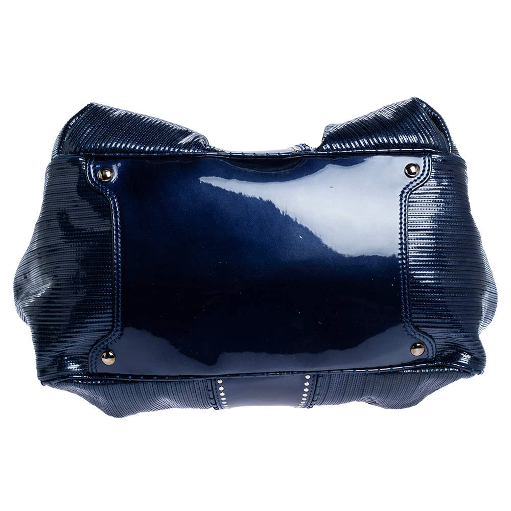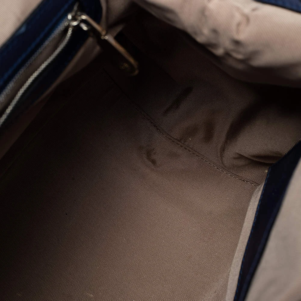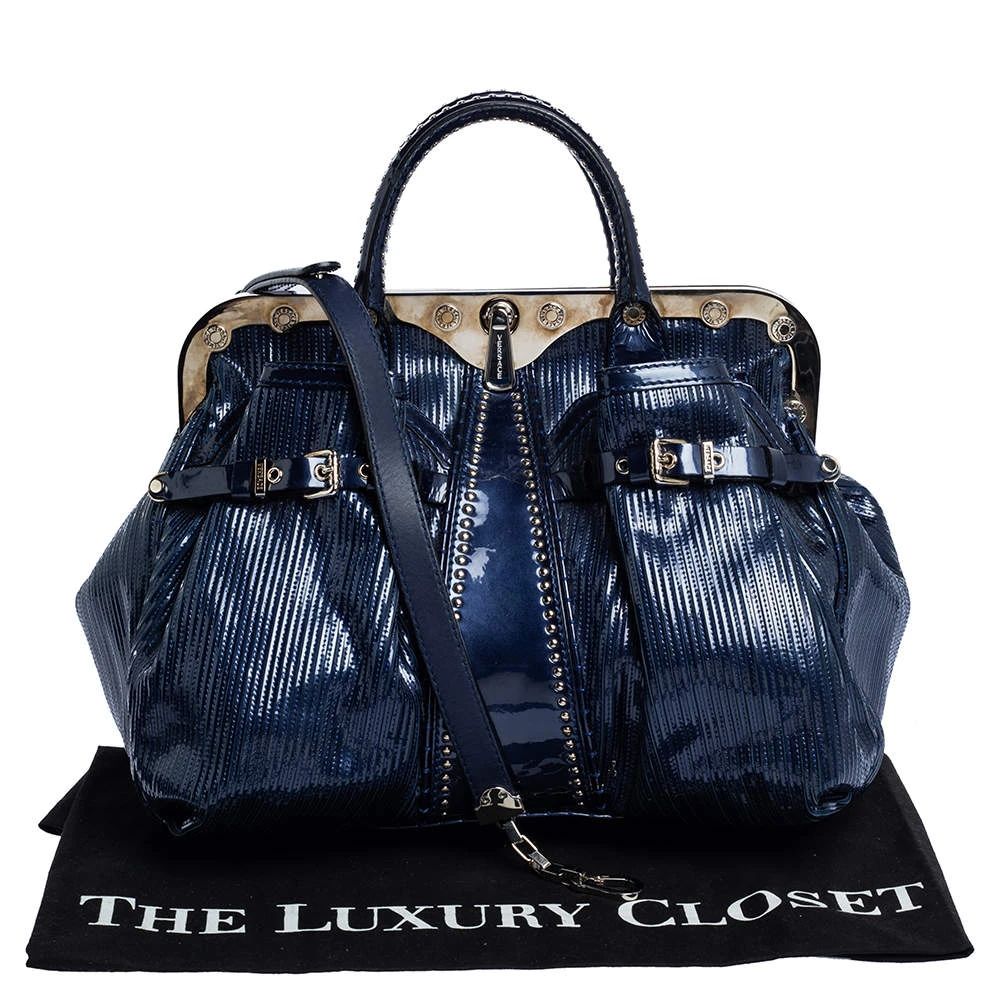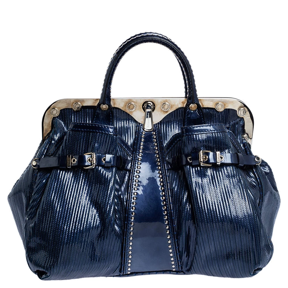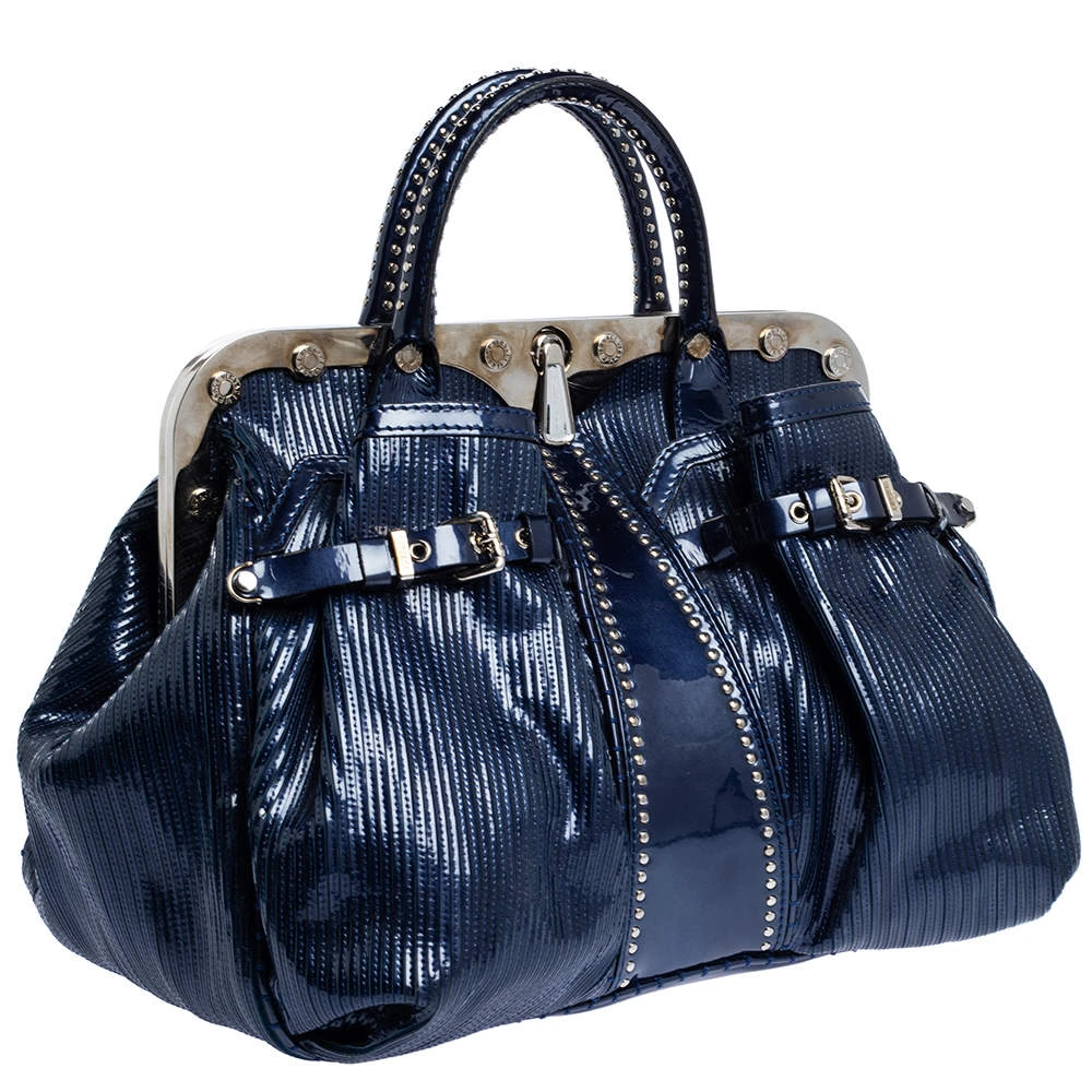 A gorgeous satchel by Versace that is characterised by great craftsmanship and alluring details all over. The satchel, made from glossy patent leather, features a blue shade and a striped texture all over the exterior. It is decorated with buckled straps and zip detailing along with label-engraved studs and the Medusa motif on the metal-framed top. The satchel is complete with two handles and a spacious interior to house your necessities.