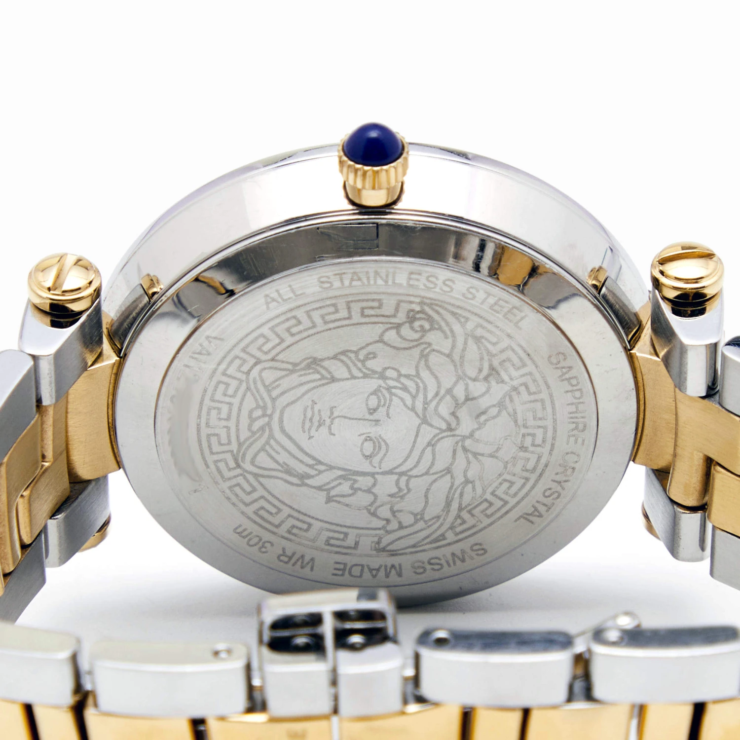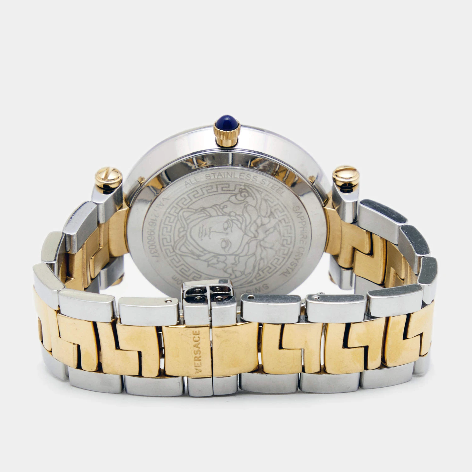 Let this timepiece by Versace help you make every moment count! The quartz watch is made using two-tone stainless steel and added with a blue dial. It is a functional accessory designed to impart a luxurious style while keeping you on time.