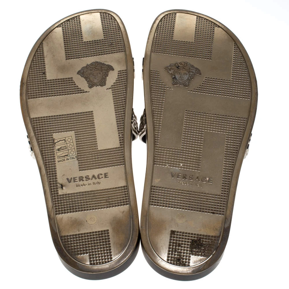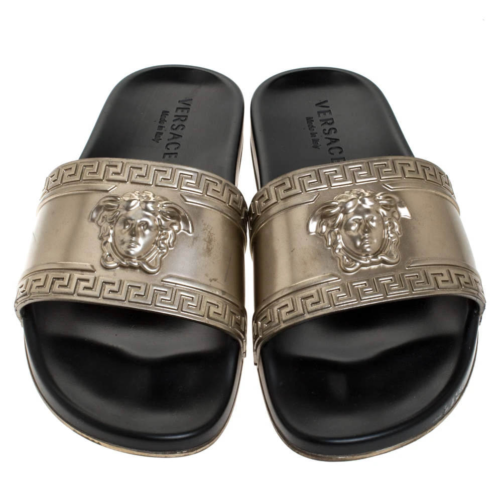 Comfort and high-fashion come to you in a luxurious wave with this pair of slides from Versace. They’ve been crafted from rubber and detailed with the signature Medusa logo on the front. The pair in bronze is water-friendly and stylish.