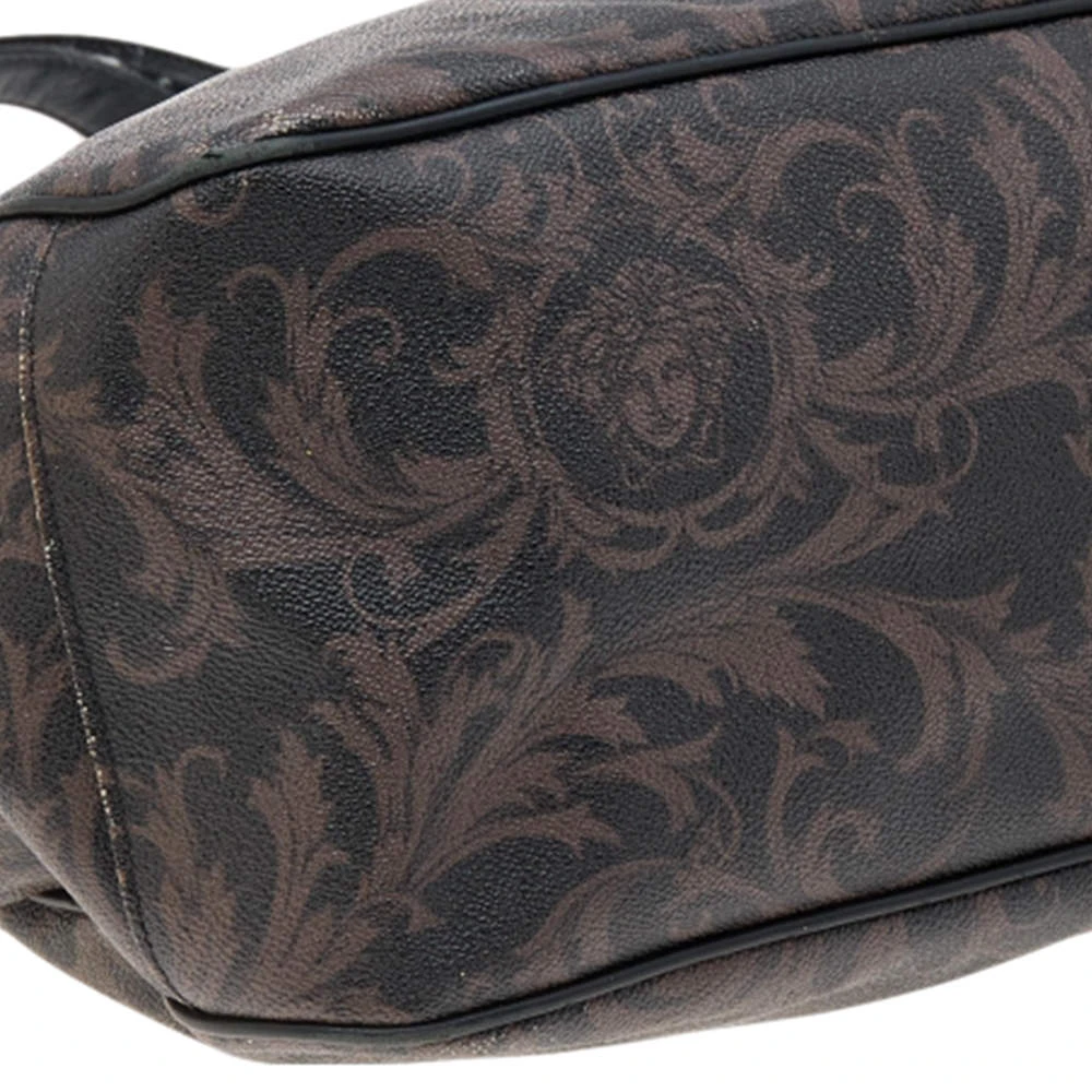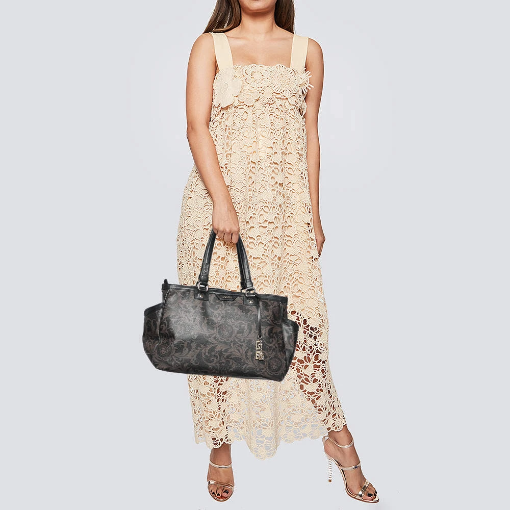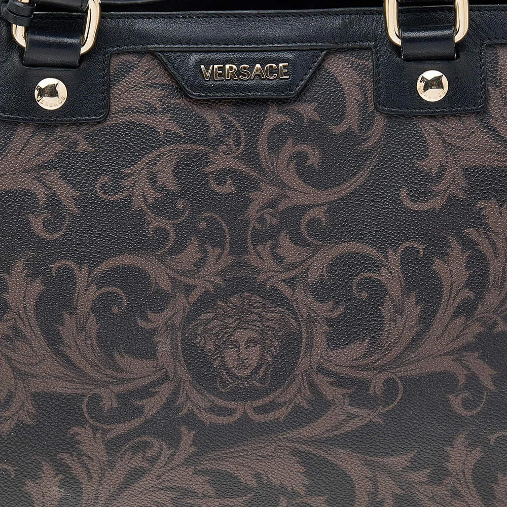 This tote is a classic Versace creation. It is crafted using brown-black Barocco-printed canvas and leather, with a gold-toned logo charm enhancing the front. It has two handles and a satin-lined interior. This tote from Versace will surely bring elegance to your attire.