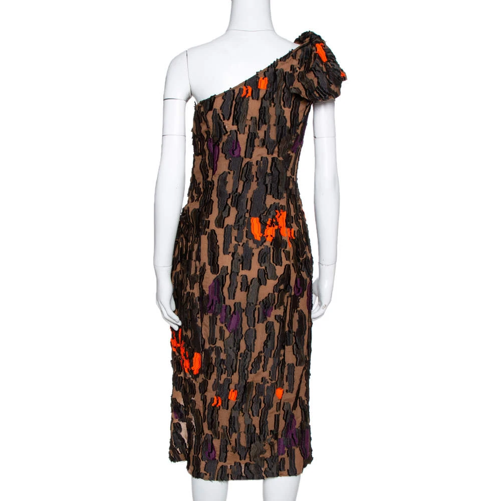 This Fil Coupé dress from the Versace’s Summer Spring 2016 collection stays true to the label’s creative DNA. This brown camouflage creation is made from jacquard fabric. The one-shoulder dress has distinct touches of orange on it. When paired with the right footwear, it can be an ideal evening attire.