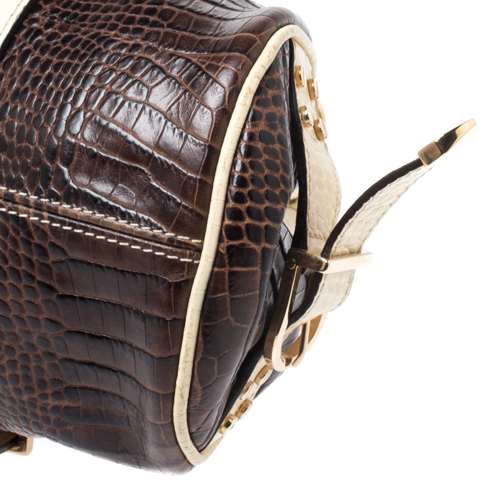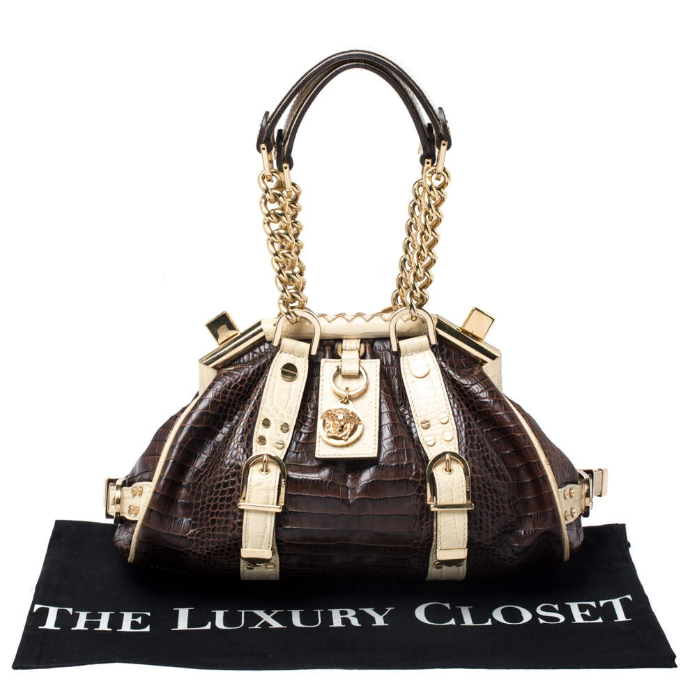 The Madonna Boston bag from Versace is made from croc-embossed leather. It comes with thick chained handles and a logo charm on the front. It is lined with fabric on the inside and will easily hold your necessities.