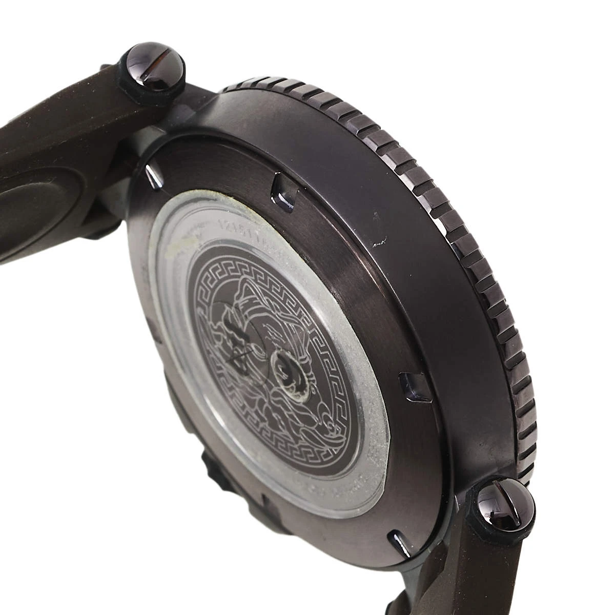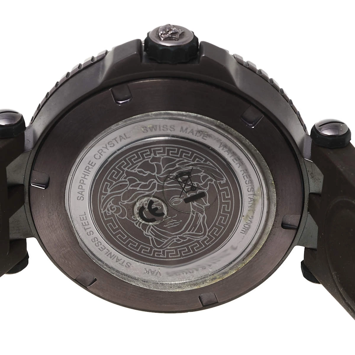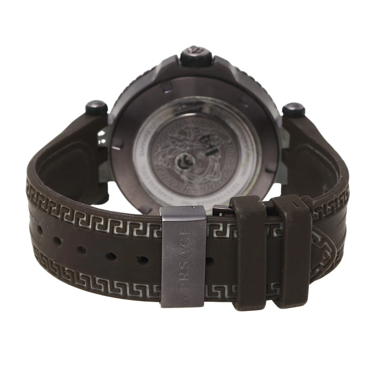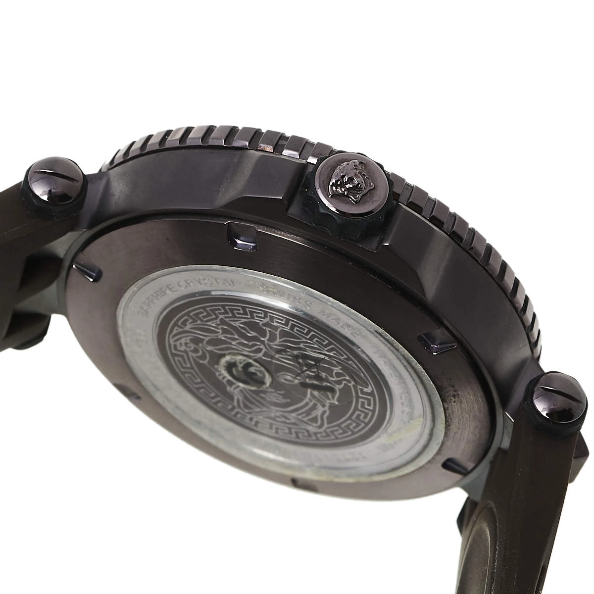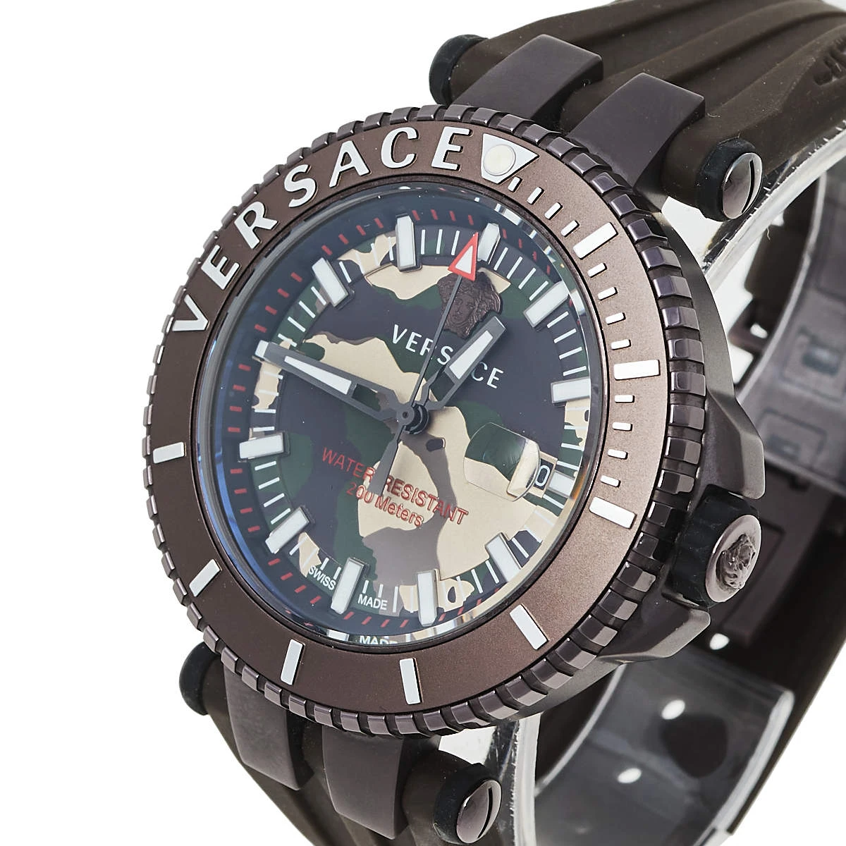 The Versace V-Race timepiece is a delight for watch lovers. Functioning on a quartz movement, the watch has an ion-plated stainless steel case with a diameter of 46 mm. While the bezel is detailed with the brand name, the camo dial boasts index hour markers, three hands, a date window, and the iconic Medusa logo. The case is neatly held by a rubber bracelet that fastens with a clasp fastening.