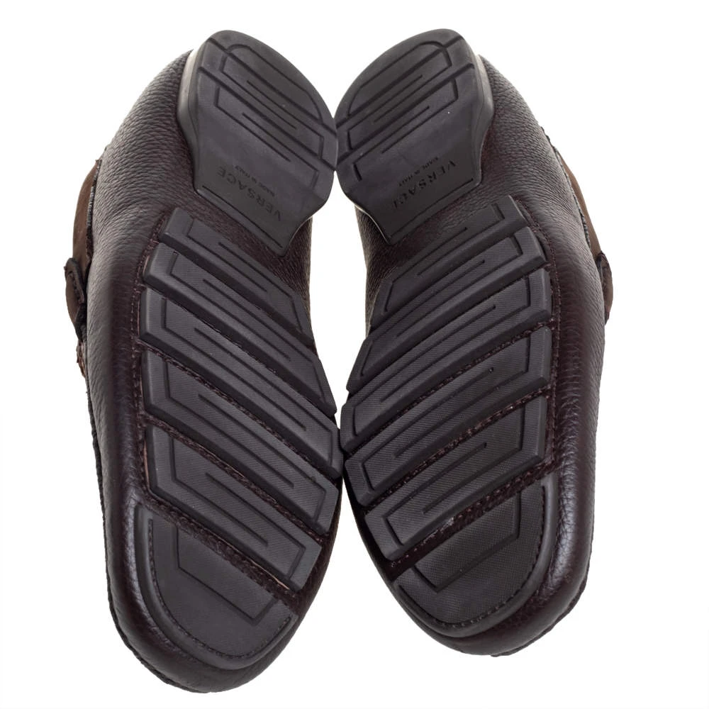 Precise stitching and a sleek shape led to the final result of this pair of loafers. They are by Versace and made from leather, python, and nubuck, and this is evidently displayed with the Medusa detail on the uppers. The brown loafers are brimming with comfort and style. (NOTE: AVAILABLE FOR UAE CUSTOMERS ONLY)