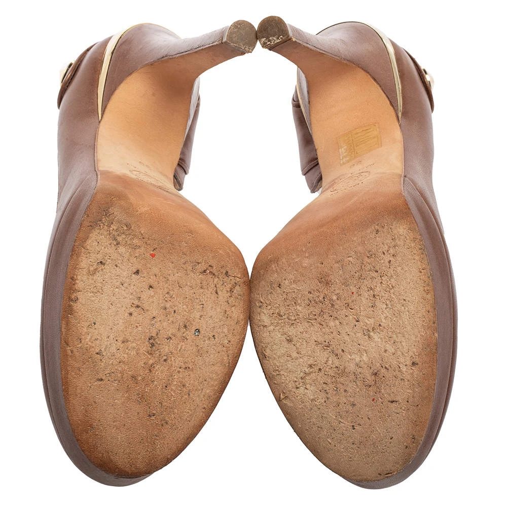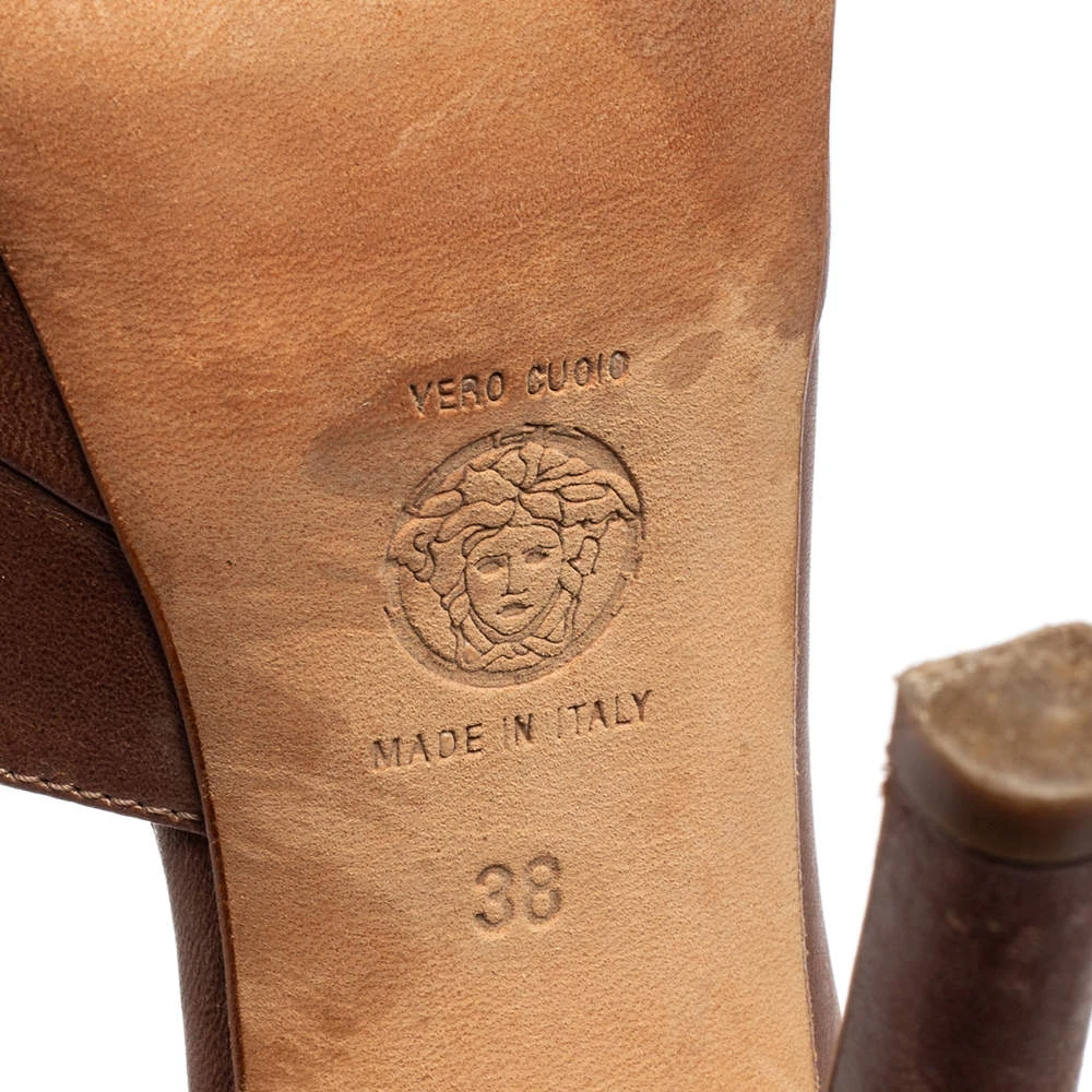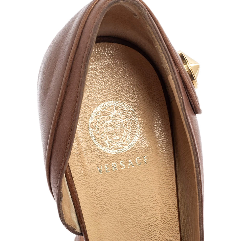 With an elegant d’Orsay cut, this pair of Versace pumps will be a valuable addition to your wardrobe. Covered in brown leather, it is decorated with gold-tone accents and the brand plaque on the round toe. The 13cm heels are supported by platforms for a smooth walk.