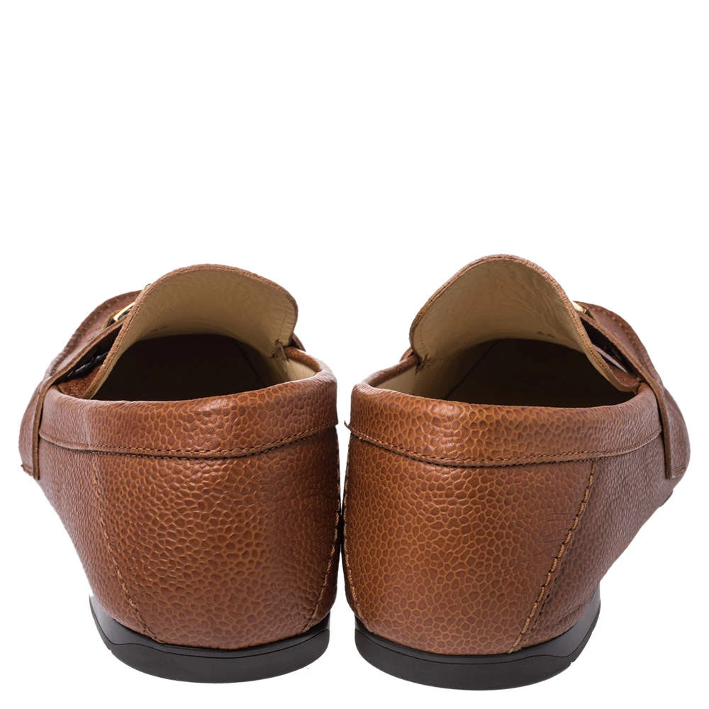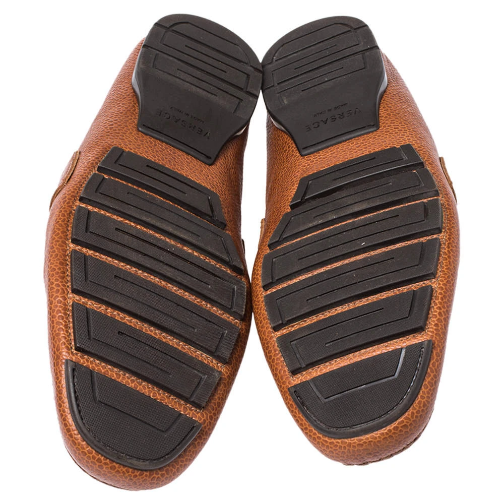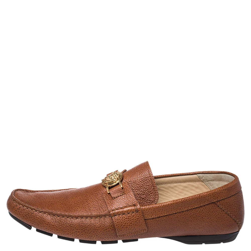 Precise stitching, use of quality leather, and a comfortable shape result in this pair of loafers. They are by Versace, and this is evidently displayed with the Medusa motif detailing on the uppers. The brown loafers are finished with gold-tone hardware and are wrapped in comfort and style.