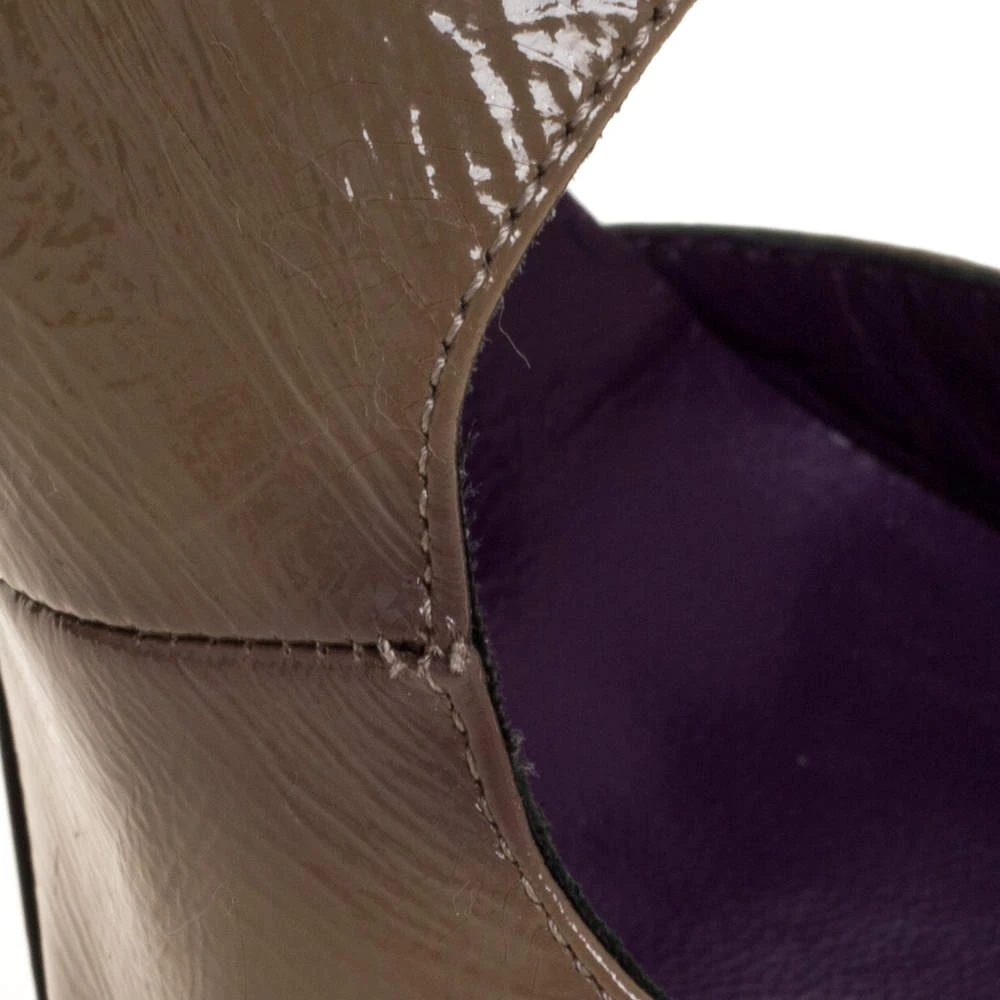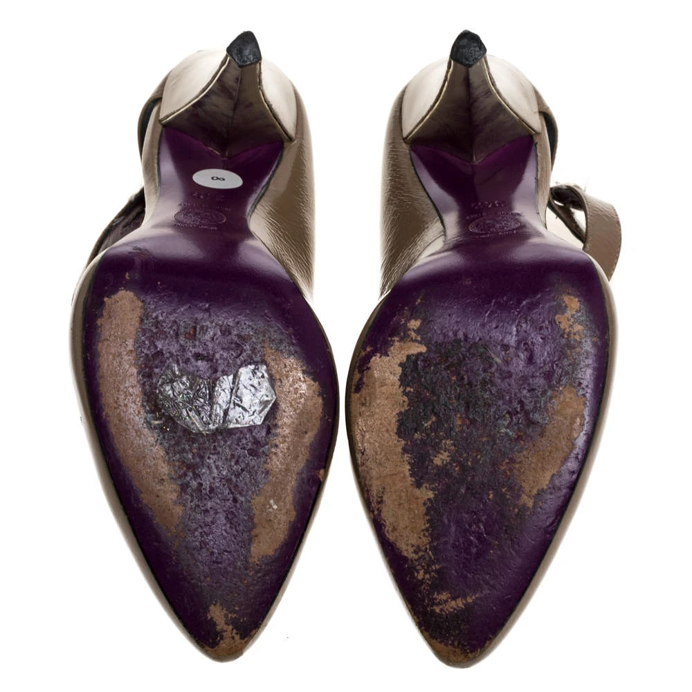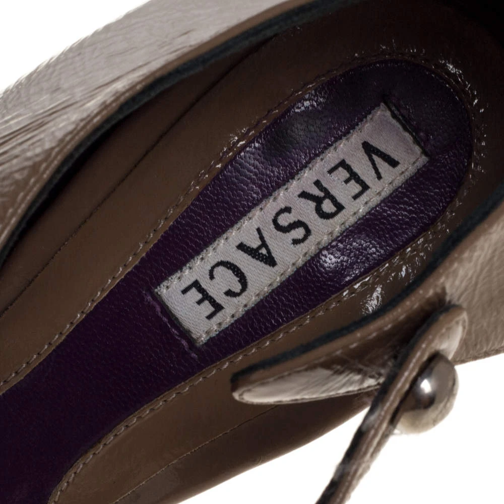 Crafted from brown patent leather, these pumps by Versace feature a half d’Orsay design. They bring pointed toes, button strap details, closed counters and 11 cm heels. The gorgeous pumps are constructed to provide both style and a stable lift.