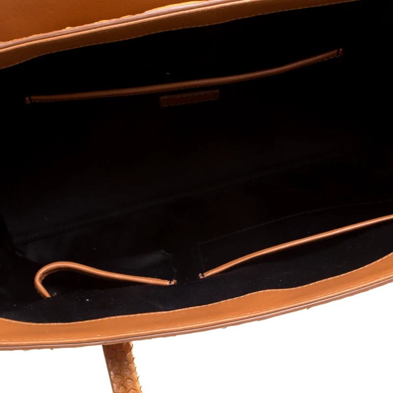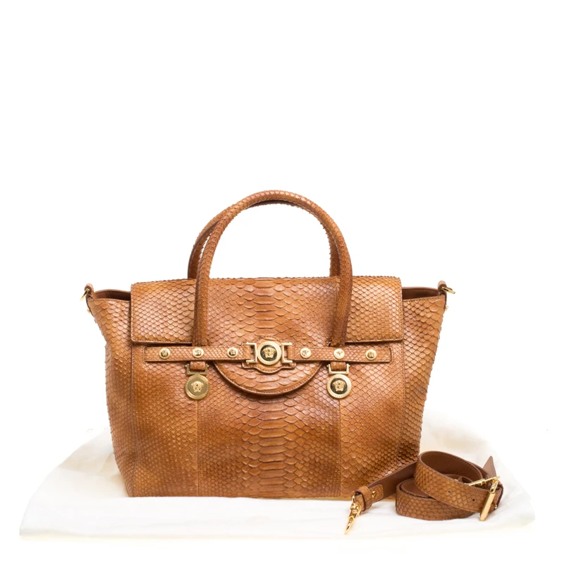 Sophisticated and luxe, this bag from Versace definitely needs to be on your wishlist. The bag is crafted from python in a lovely brown shade and it features a structured silhouette. It flaunts dual handles, a removable shoulder strap and the famous Medusa logo on the front. The spacious fabric interior houses three slip pockets.