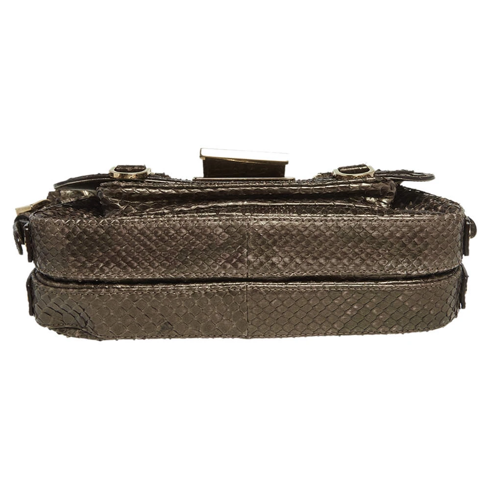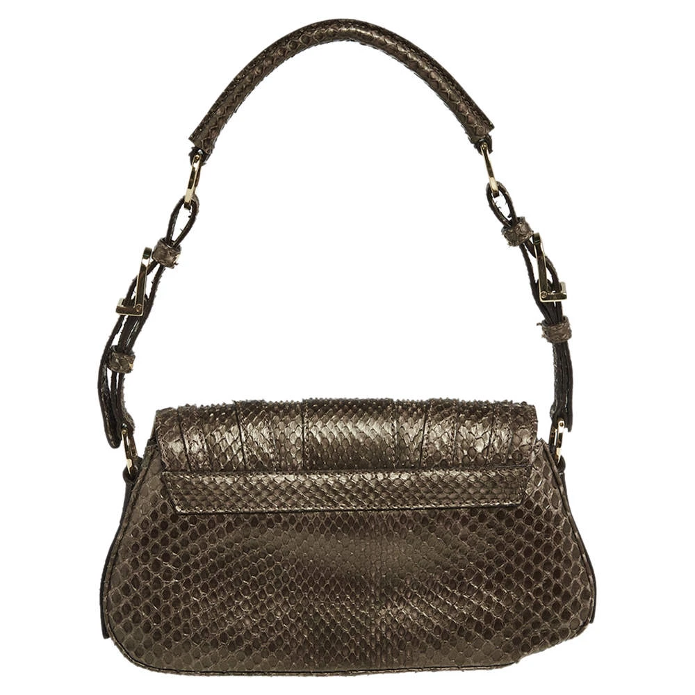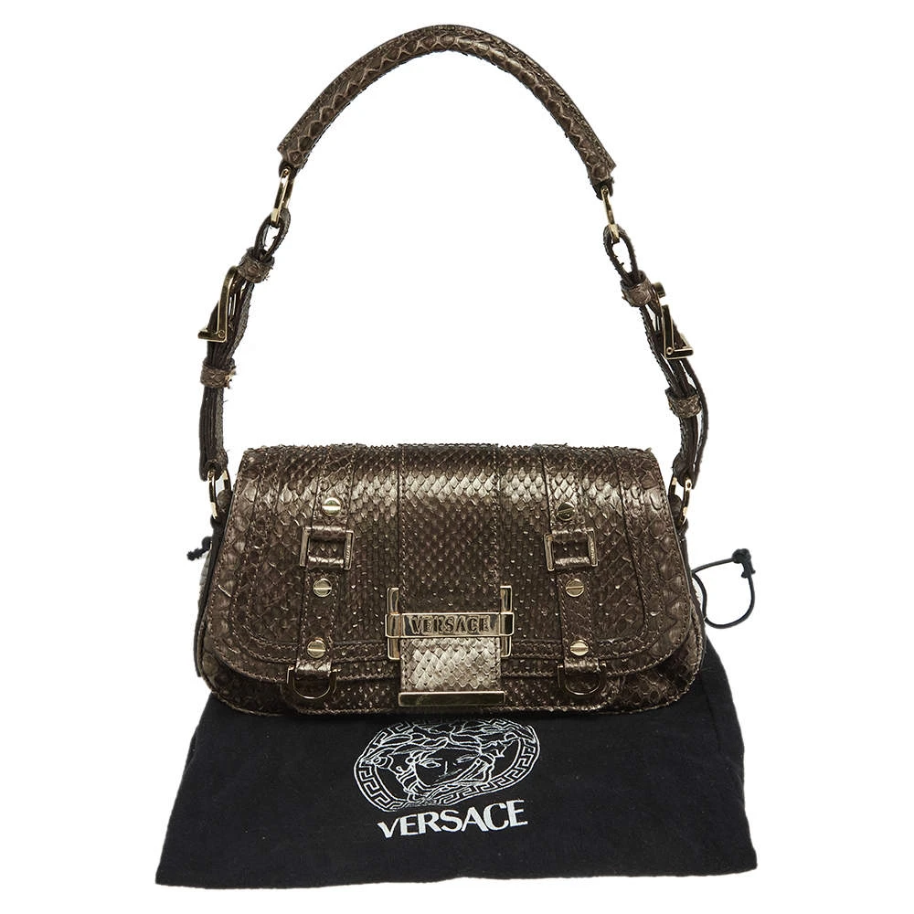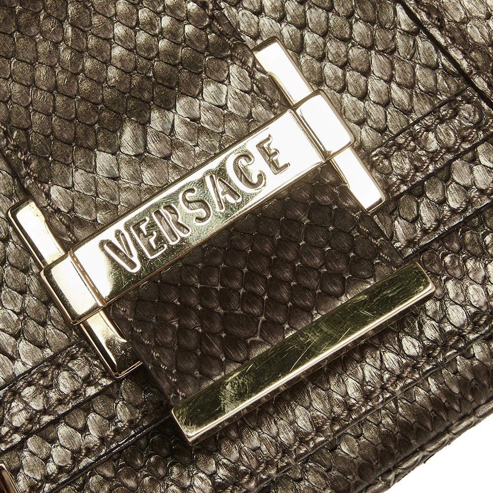 Make a striking appearance with this fashionable shoulder bag by Versace. This elegant creation is at once a fashion statement as well as a rational necessity. It is crafted from python leather and is adorned with gold-tone metal accents. Lined with satin, it has a spacious interior where you can stow your basics. This pretty piece is complete with a shoulder strap.