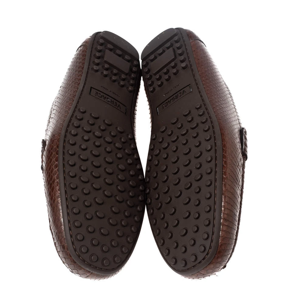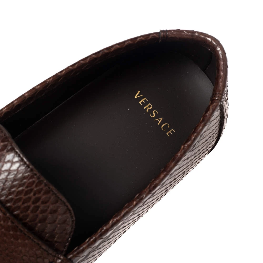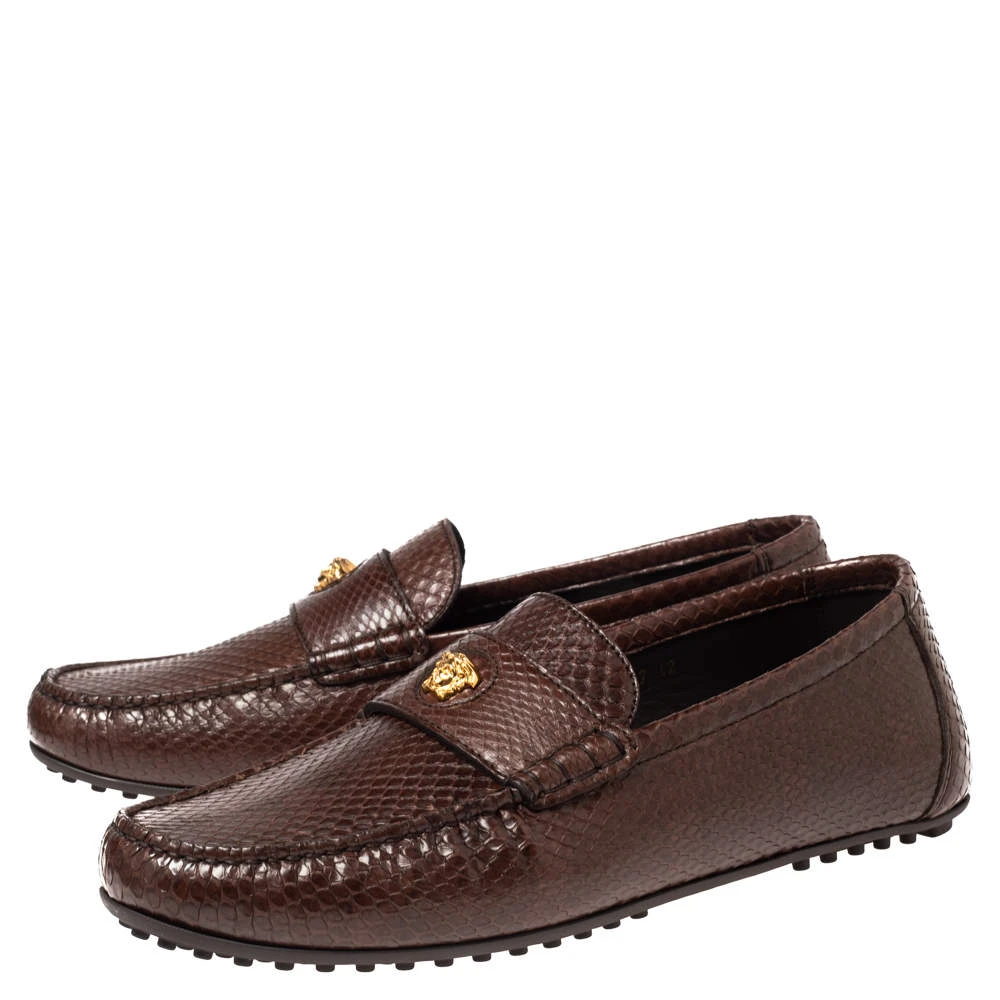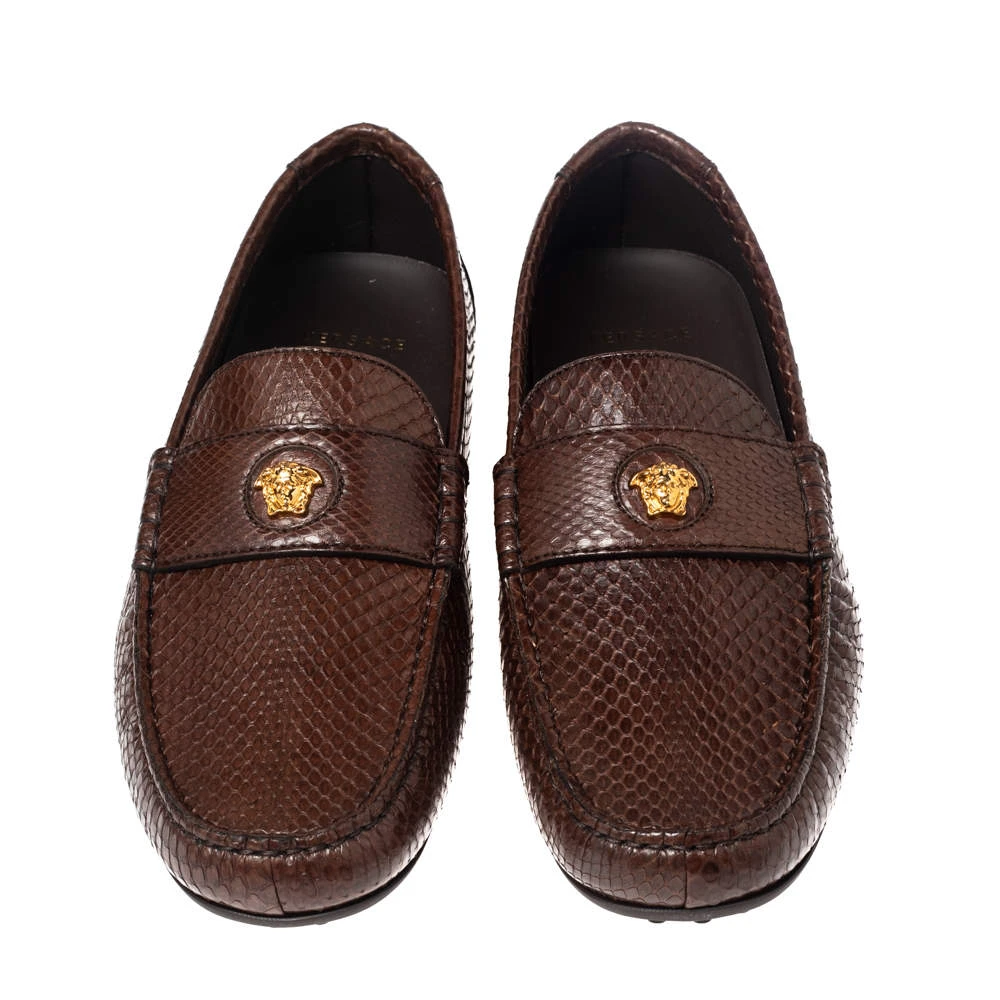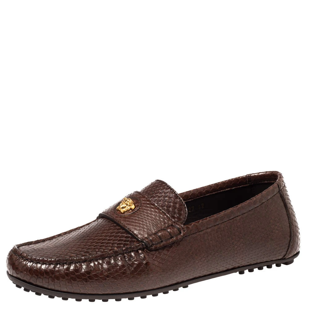 Functional and stylish, Versace’s collections capture the effortless, nonchalant finesse of the modern man. Crafted from snakeskin leather in a brown shade, these loafers are so comfortable you’ll never want to take them off. They are topped with the Medusa logo for a signature finish.