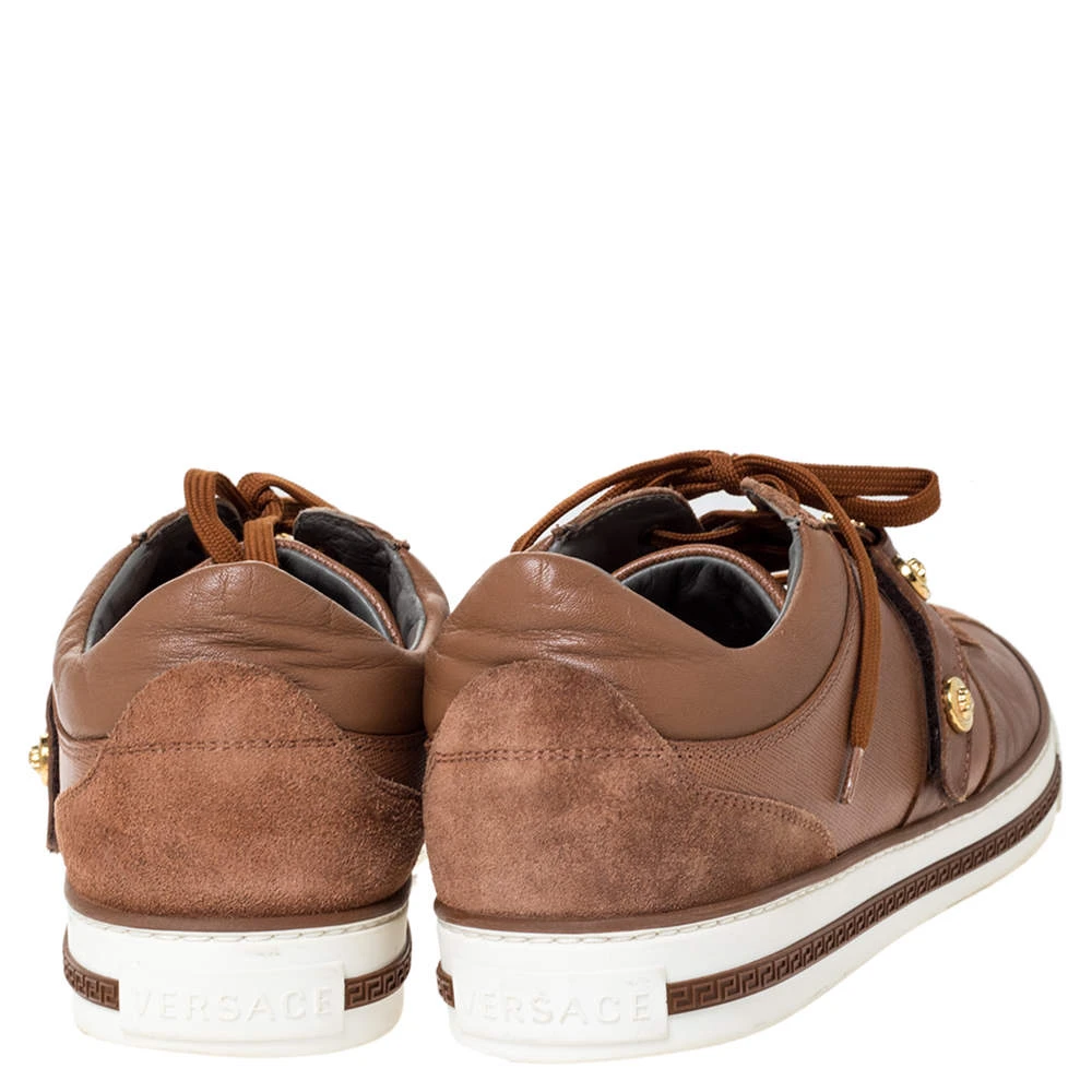 These suede and leather sneakers are meant to lend a luxe twist to your outfit. Looking fashionable in your casuals is as easy as slipping into these brown sneakers. Designed by Versace, they feature the Medusa detail, lace-up vamps and rubber soles.
