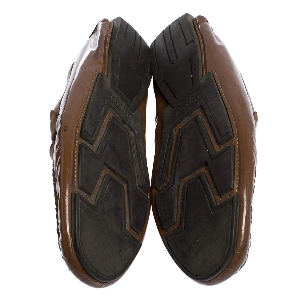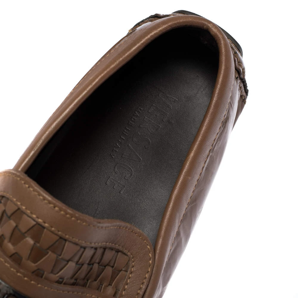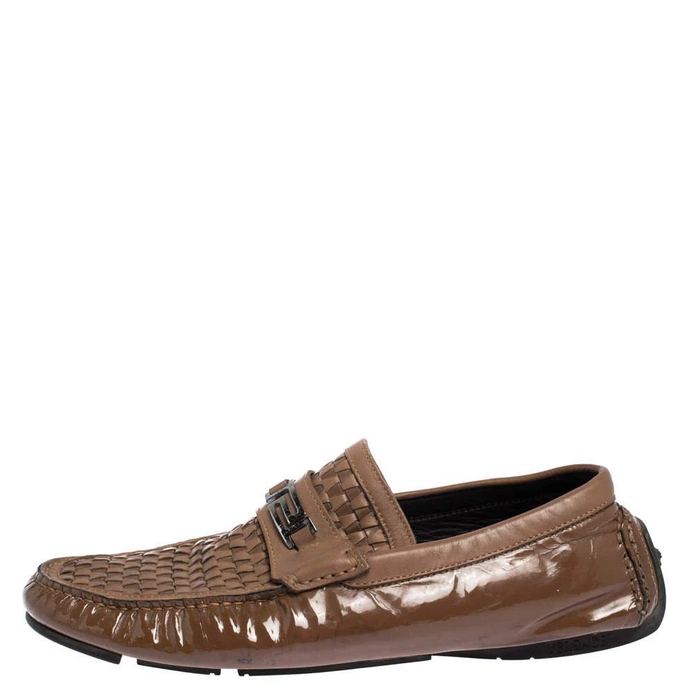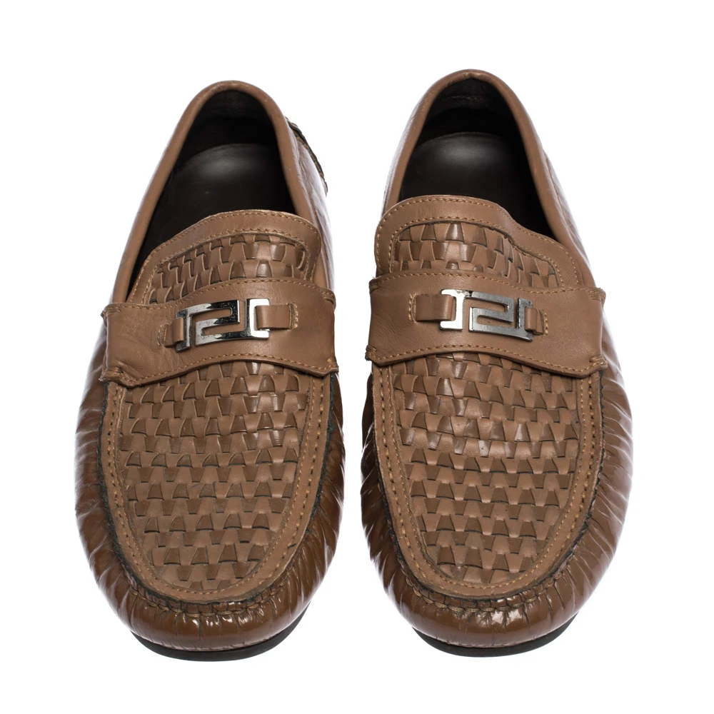 Tick all the style boxes when you wear this pair of timeless Versace loafers. They are crafted from high-quality leather and styled with metal motifs on the uppers and durable soles for lasting wear. Give your style a luxe spin with these stylish brown shoes.