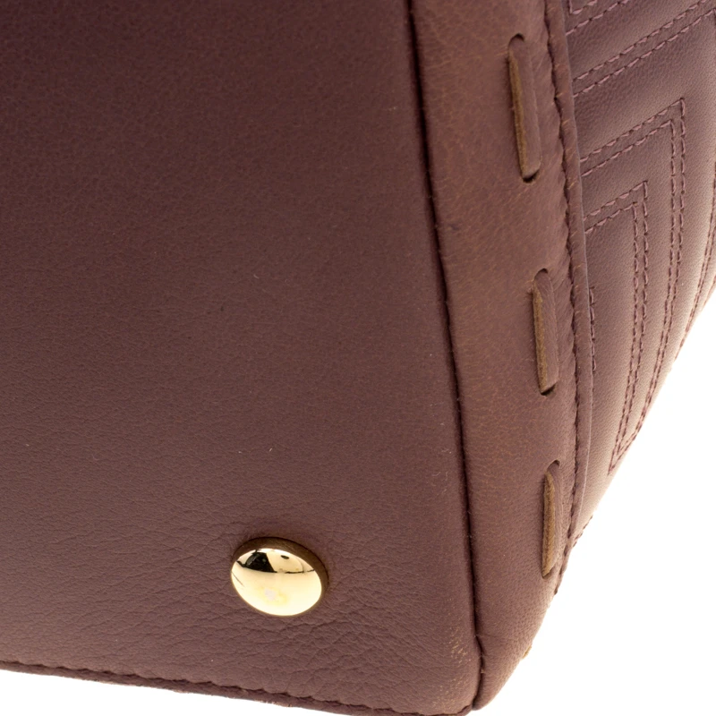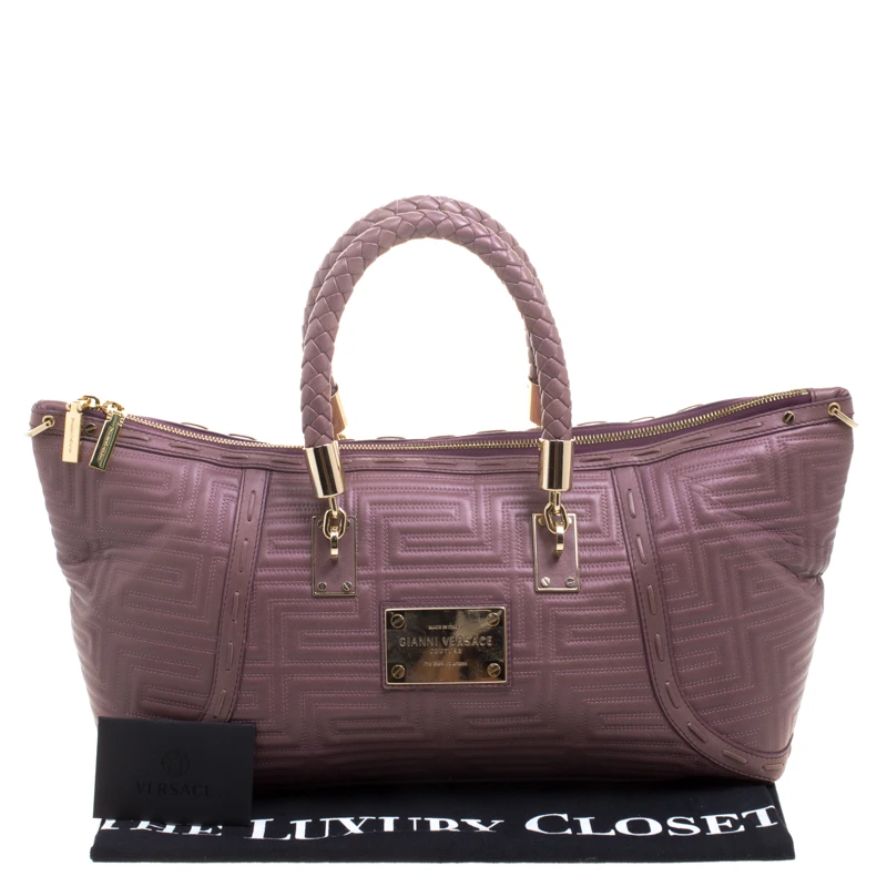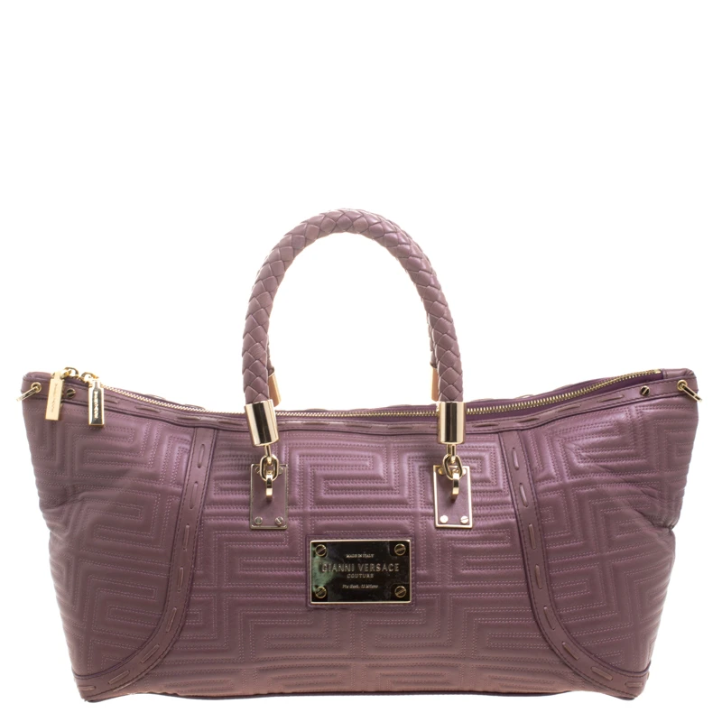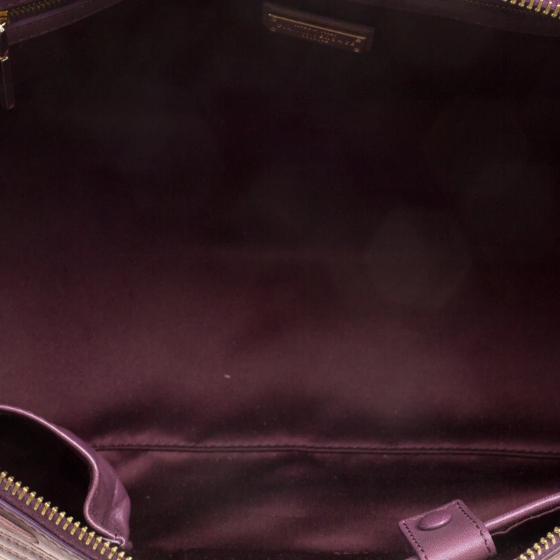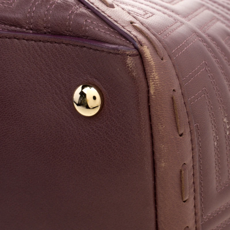 An absolute delight, this satchel is a Versace creation. It has been crafted from embossed leather and enhanced with gold tone hardware. The bag comes with a dark beige exterior that flaunts the brand label while being held by two braided handles. It is complete with protective metal feet and a spacious satin lined interior.