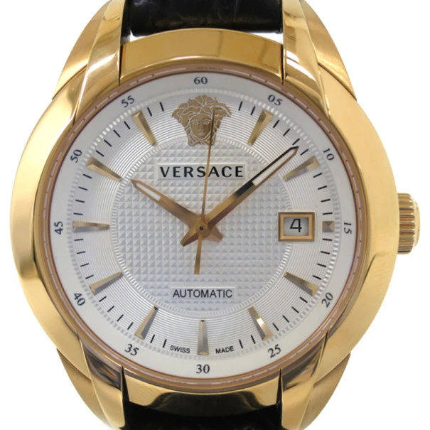 This Versace Charcter Wristwatch for men is simply stunning. The round white textured dial hosts gold bars, a date window and a Versace logo representing the head of Medusa. The gold plated case showcases an exhibition case back. The quality leather black strap fastens on the wrist with a fold over clasp mechanism. This water resistant timepiece will accentuate your presence in every ceremonial event.Gender: MenOriginal Retail Price: USD $2,200Condition: NewCase Size: 42 MMBand material: LeatherBand Size: 14.5-19.5 CMMovement: AutomaticCase material: Gold PlatedIncludes: Original Box, Case, Guarantee Card, Manual Book, Original Dust Bag