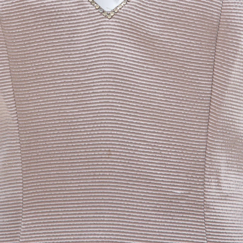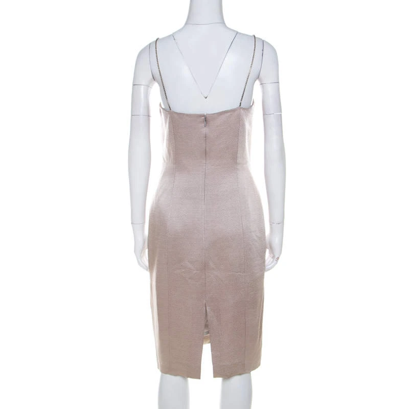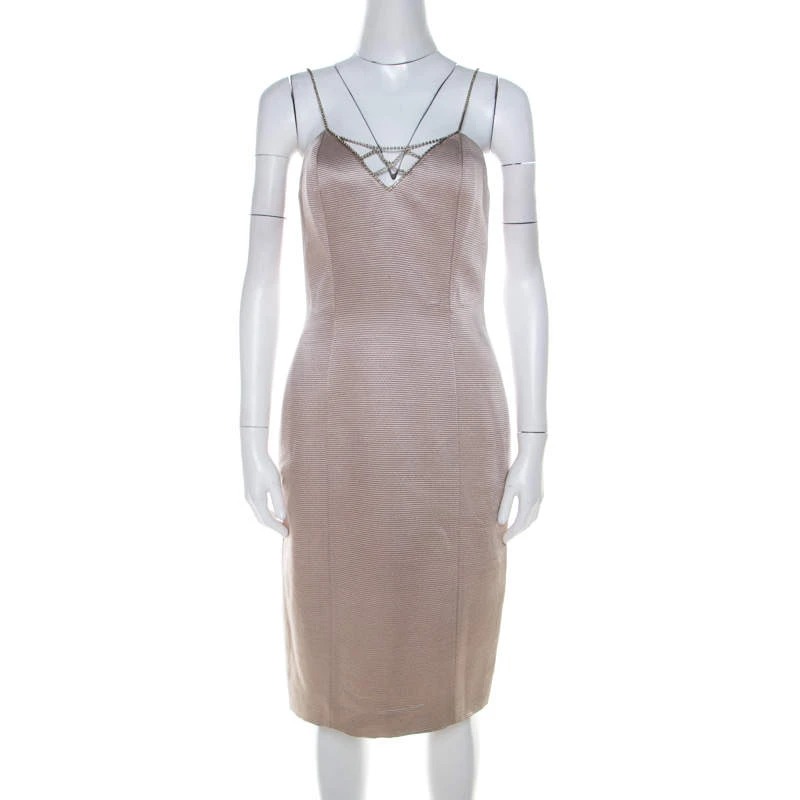 This Versace attire is a posh pick and will lend a classic touch. The metallic colour brings about a glamorous touch to the creation. Made in blended fabric, this attractive number features a ribbed design all over along with rhinestone straps. The dress enhances your charisma and keeps you at your stunning best always.