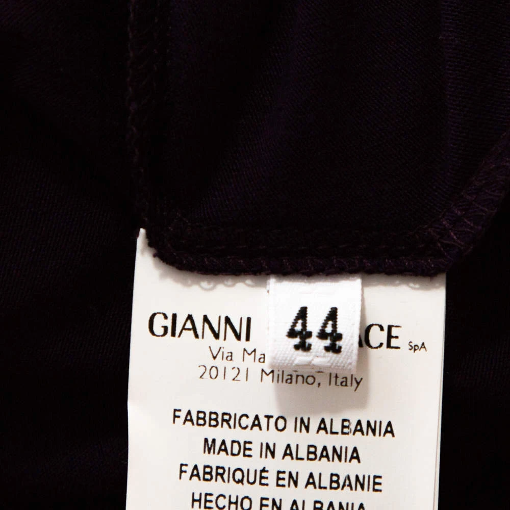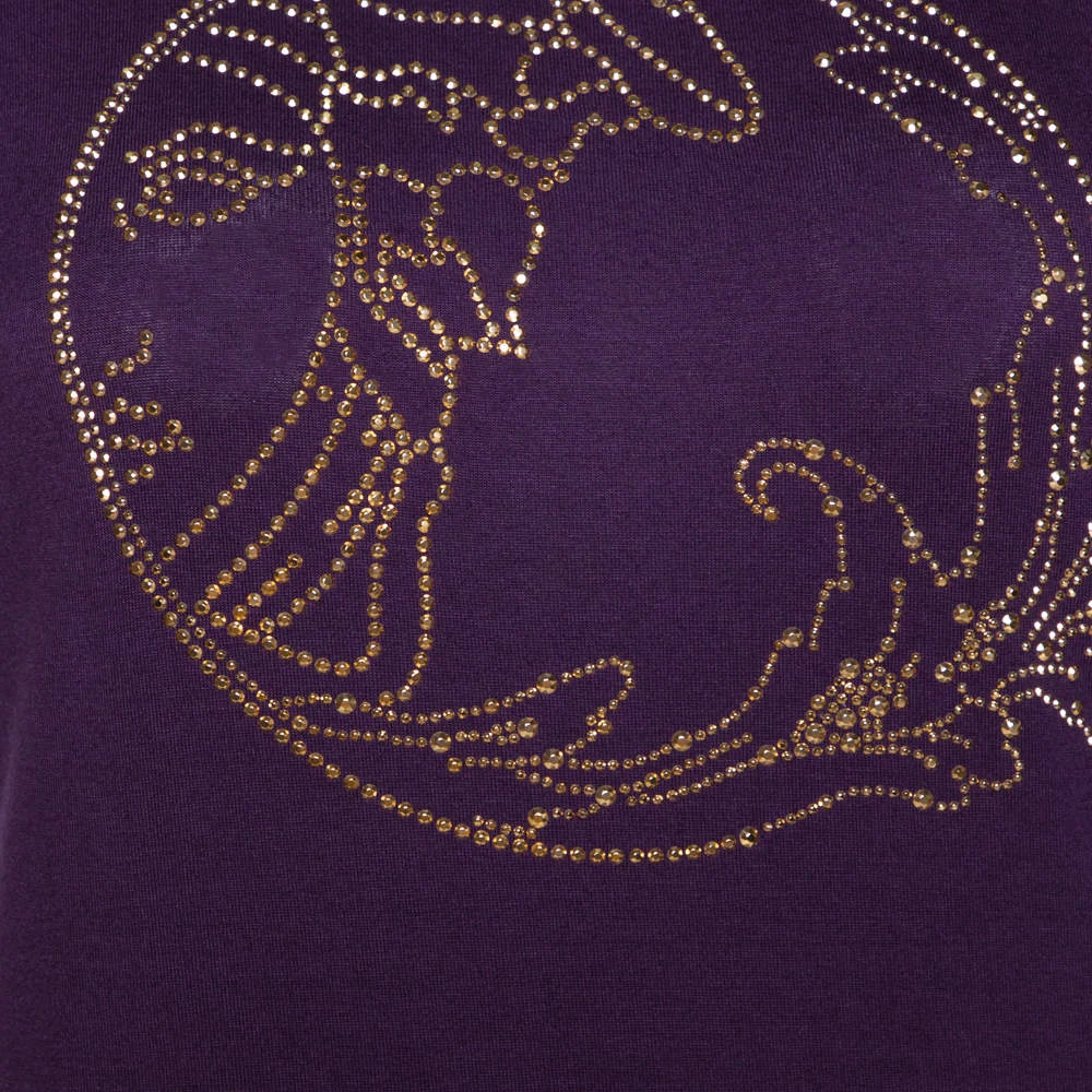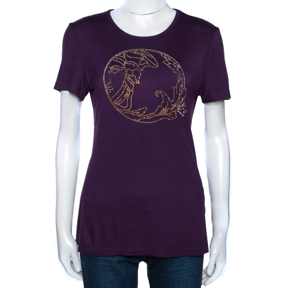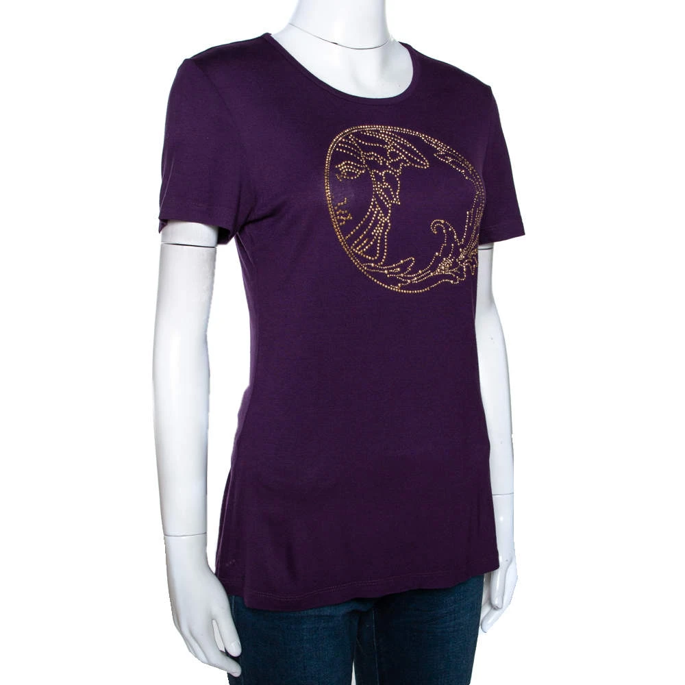 This t-shirt comes from the house of Versace. It is crafted from quality fabrics and flaunts a pretty shade of purple. It is styled with a round neckline, short sleeves, stud details on the front. It is great for casual days and will pair well with jeans.