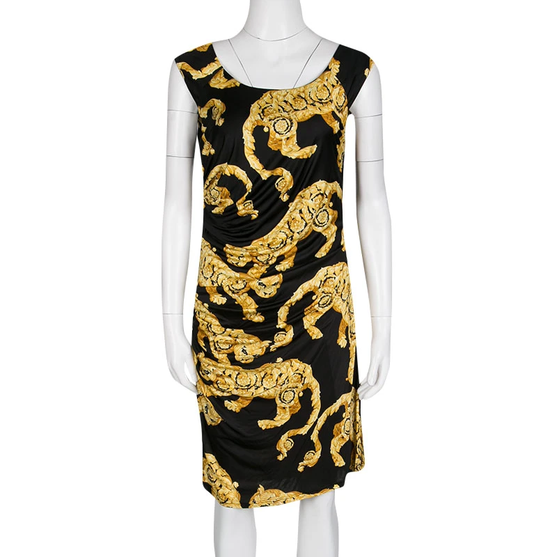 Lovely, isn’t it? This dress by Versace Collection is so beautiful, you’ll look high-fashion every time you slip into it. Keeping their famous signature of gold through the cat prints, the sleeveless dress is made complete with drape details. A glossy pair of black sandals will look great with this creation.