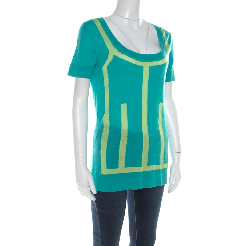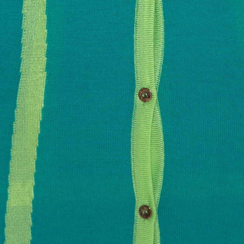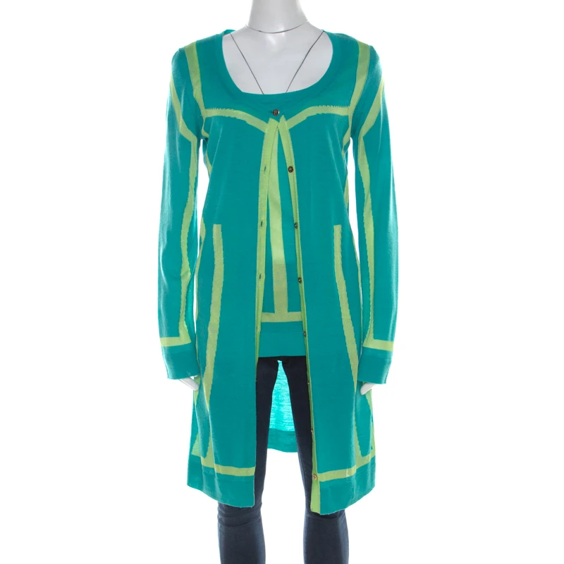 This fabulous set is from Versace Collection and it delights with a top and a matching cardigan. They’ve been knit from the finest fabrics and while the top comes with short sleeves and a broad neckline, the cardigan comes with long sleeves and long length. You can team this set with a pair of a variety of bottoms. This set has a cardigan of large size ( IT 46 / US10 ) and an inner top is of size medium ( IT 44 / US 10 ).